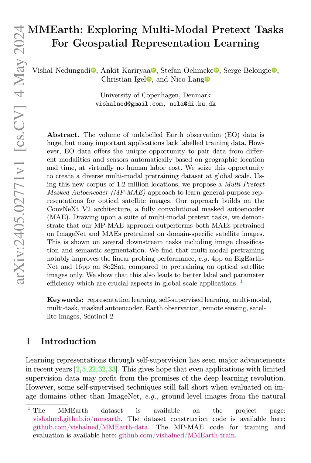 The volume of unlabelled Earth observation (EO) data is huge, but many important applications lack labelled training data. However, EO data offers the unique opportunity to pair data from different modalities and sensors automatically based on geographic location and time, at virtually no human labor cost. We seize this opportunity to create MMEarth, a diverse multi-modal pretraining dataset at global scale. Using this new corpus of 1.2 million locations, we propose a Multi-Pretext Masked Autoencoder (MP-MAE) approach to learn general-purpose representations for optical satellite images. Our approach builds on the ConvNeXt V2 architecture, a fully convolutional masked autoencoder (MAE). Drawing upon a suite of multi-modal pretext tasks, we demonstrate that our MP-MAE approach outperforms both MAEs pretrained on ImageNet and MAEs pretrained on domain-specific satellite images. This is shown on several downstream tasks including image classification and semantic segmentation. We find that pretraining with multi-modal pretext tasks notably improves the linear probing performance compared to pretraining on optical satellite images only. This also leads to better label efficiency and parameter efficiency which are crucial aspects in global scale applications.
