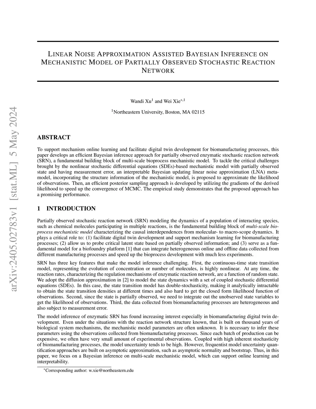 To support mechanism online learning and facilitate digital twin development for biomanufacturing processes, this paper develops an efficient Bayesian inference approach for partially observed enzymatic stochastic reaction network (SRN), a fundamental building block of multi-scale bioprocess mechanistic model. To tackle the critical challenges brought by the nonlinear stochastic differential equations (SDEs)-based mechanistic model with partially observed state and having measurement errors, an interpretable Bayesian updating linear noise approximation (LNA) metamodel, incorporating the structure information of the mechanistic model, is proposed to approximate the likelihood of observations. Then, an efficient posterior sampling approach is developed by utilizing the gradients of the derived likelihood to speed up the convergence of Markov Chain Monte Carlo (MCMC). The empirical study demonstrates that the proposed approach has a promising performance.