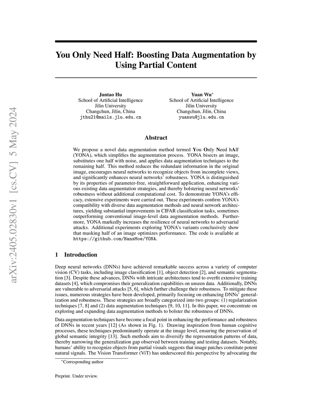 We propose a novel data augmentation method termed You Only Need hAlf (YONA), which simplifies the augmentation process. YONA bisects an image, substitutes one half with noise, and applies data augmentation techniques to the remaining half. This method reduces the redundant information in the original image, encourages neural networks to recognize objects from incomplete views, and significantly enhances neural networks' robustness. YONA is distinguished by its properties of parameter-free, straightforward application, enhancing various existing data augmentation strategies, and thereby bolstering neural networks' robustness without additional computational cost. To demonstrate YONA's efficacy, extensive experiments were carried out. These experiments confirm YONA's compatibility with diverse data augmentation methods and neural network architectures, yielding substantial improvements in CIFAR classification tasks, sometimes outperforming conventional image-level data augmentation methods. Furthermore, YONA markedly increases the resilience of neural networks to adversarial attacks. Additional experiments exploring YONA's variants conclusively show that masking half of an image optimizes performance. The code is available at https://github.com/HansMoe/YONA.