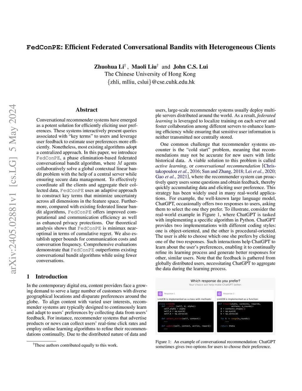 FedConPE: Efficient Federated Conversational Bandits with Heterogeneous