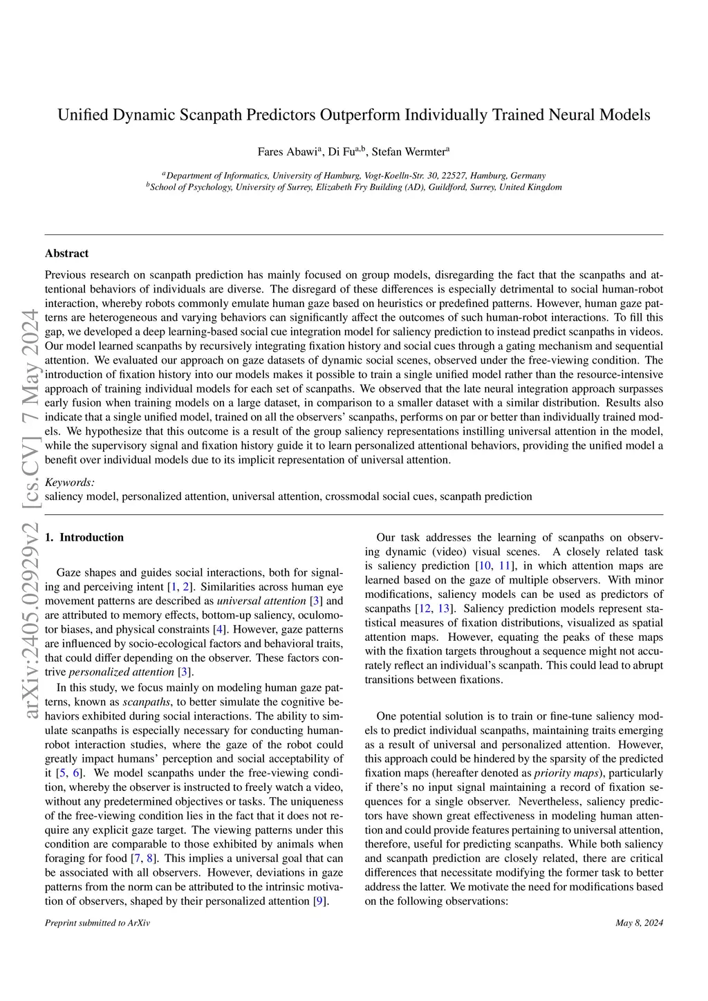 Previous research on scanpath prediction has mainly focused on group models, disregarding the fact that the scanpaths and attentional behaviors of individuals are diverse. The disregard of these differences is especially detrimental to social human-robot interaction, whereby robots commonly emulate human gaze based on heuristics or predefined patterns. However, human gaze patterns are heterogeneous and varying behaviors can significantly affect the outcomes of such human-robot interactions. To fill this gap, we developed a deep learning-based social cue integration model for saliency prediction to instead predict scanpaths in videos. Our model learned scanpaths by recursively integrating fixation history and social cues through a gating mechanism and sequential attention. We evaluated our approach on gaze datasets of dynamic social scenes, observed under the free-viewing condition. The introduction of fixation history into our models makes it possible to train a single unified model rather than the resource-intensive approach of training individual models for each set of scanpaths. We observed that the late neural integration approach surpasses early fusion when training models on a large dataset, in comparison to a smaller dataset with a similar distribution. Results also indicate that a single unified model, trained on all the observers' scanpaths, performs on par or better than individually trained models. We hypothesize that this outcome is a result of the group saliency representations instilling universal attention in the model, while the supervisory signal and fixation history guide it to learn personalized attentional behaviors, providing the unified model a benefit over individual models due to its implicit representation of universal attention.