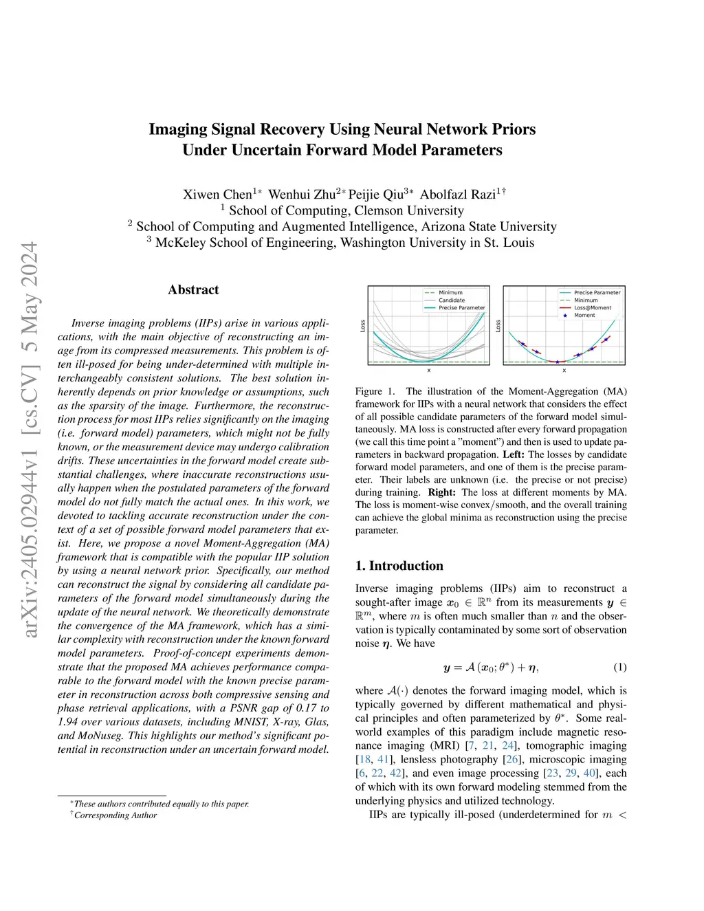 Inverse imaging problems (IIPs) arise in various applications, with the main objective of reconstructing an image from its compressed measurements. This problem is often ill-posed for being under-determined with multiple interchangeably consistent solutions. The best solution inherently depends on prior knowledge or assumptions, such as the sparsity of the image. Furthermore, the reconstruction process for most IIPs relies significantly on the imaging (i.e. forward model) parameters, which might not be fully known, or the measurement device may undergo calibration drifts. These uncertainties in the forward model create substantial challenges, where inaccurate reconstructions usually happen when the postulated parameters of the forward model do not fully match the actual ones. In this work, we devoted to tackling accurate reconstruction under the context of a set of possible forward model parameters that exist. Here, we propose a novel Moment-Aggregation (MA) framework that is compatible with the popular IIP solution by using a neural network prior. Specifically, our method can reconstruct the signal by considering all candidate parameters of the forward model simultaneously during the update of the neural network. We theoretically demonstrate the convergence of the MA framework, which has a similar complexity with reconstruction under the known forward model parameters. Proof-of-concept experiments demonstrate that the proposed MA achieves performance comparable to the forward model with the known precise parameter in reconstruction across both compressive sensing and phase retrieval applications, with a PSNR gap of 0.17 to 1.94 over various datasets, including MNIST, X-ray, Glas, and MoNuseg. This highlights our method's significant potential in reconstruction under an uncertain forward model.