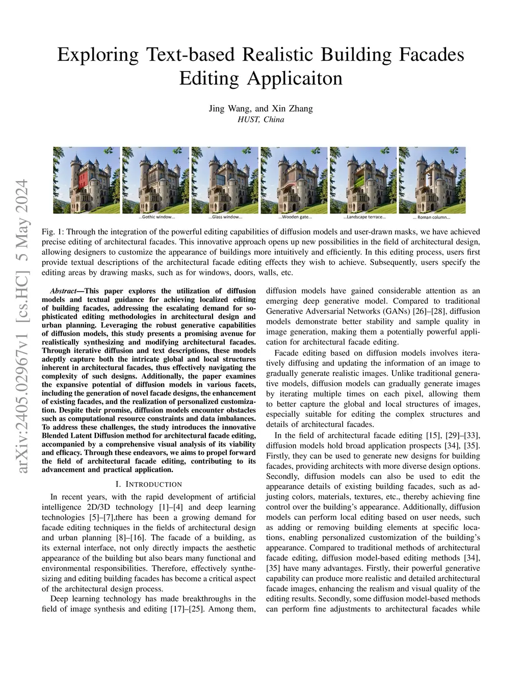 This paper explores the utilization of diffusion models and textual guidance for achieving localized editing of building facades, addressing the escalating demand for sophisticated editing methodologies in architectural design and urban planning. Leveraging the robust generative capabilities of diffusion models, this study presents a promising avenue for realistically synthesizing and modifying architectural facades. Through iterative diffusion and text descriptions, these models adeptly capture both the intricate global and local structures inherent in architectural facades, thus effectively navigating the complexity of such designs. Additionally, the paper examines the expansive potential of diffusion models in various facets, including the generation of novel facade designs, the enhancement of existing facades, and the realization of personalized customization. Despite their promise, diffusion models encounter obstacles such as computational resource constraints and data imbalances. To address these challenges, the study introduces the innovative Blended Latent Diffusion method for architectural facade editing, accompanied by a comprehensive visual analysis of its viability and efficacy. Through these endeavors, we aims to propel forward the field of architectural facade editing, contributing to its advancement and practical application.