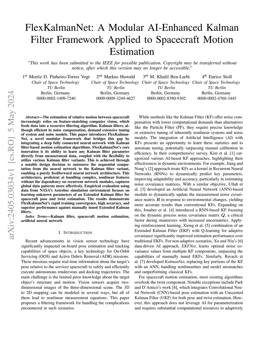 The estimation of relative motion between spacecraft increasingly relies on feature-matching computer vision, which feeds data into a recursive filtering algorithm. Kalman filters, although efficient in noise compensation, demand extensive tuning of system and noise models. This paper introduces FlexKalmanNet, a novel modular framework that bridges this gap by integrating a deep fully connected neural network with Kalman filter-based motion estimation algorithms. FlexKalmanNet's core innovation is its ability to learn any Kalman filter parameter directly from measurement data, coupled with the flexibility to utilize various Kalman filter variants. This is achieved through a notable design decision to outsource the sequential computation from the neural network to the Kalman filter variant, enabling a purely feedforward neural network architecture. This architecture, proficient at handling complex, nonlinear features without the dependency on recurrent network modules, captures global data patterns more effectively. Empirical evaluation using data from NASA's Astrobee simulation environment focuses on learning unknown parameters of an Extended Kalman filter for spacecraft pose and twist estimation. The results demonstrate FlexKalmanNet's rapid training convergence, high accuracy, and superior performance against manually tuned Extended Kalman filters.