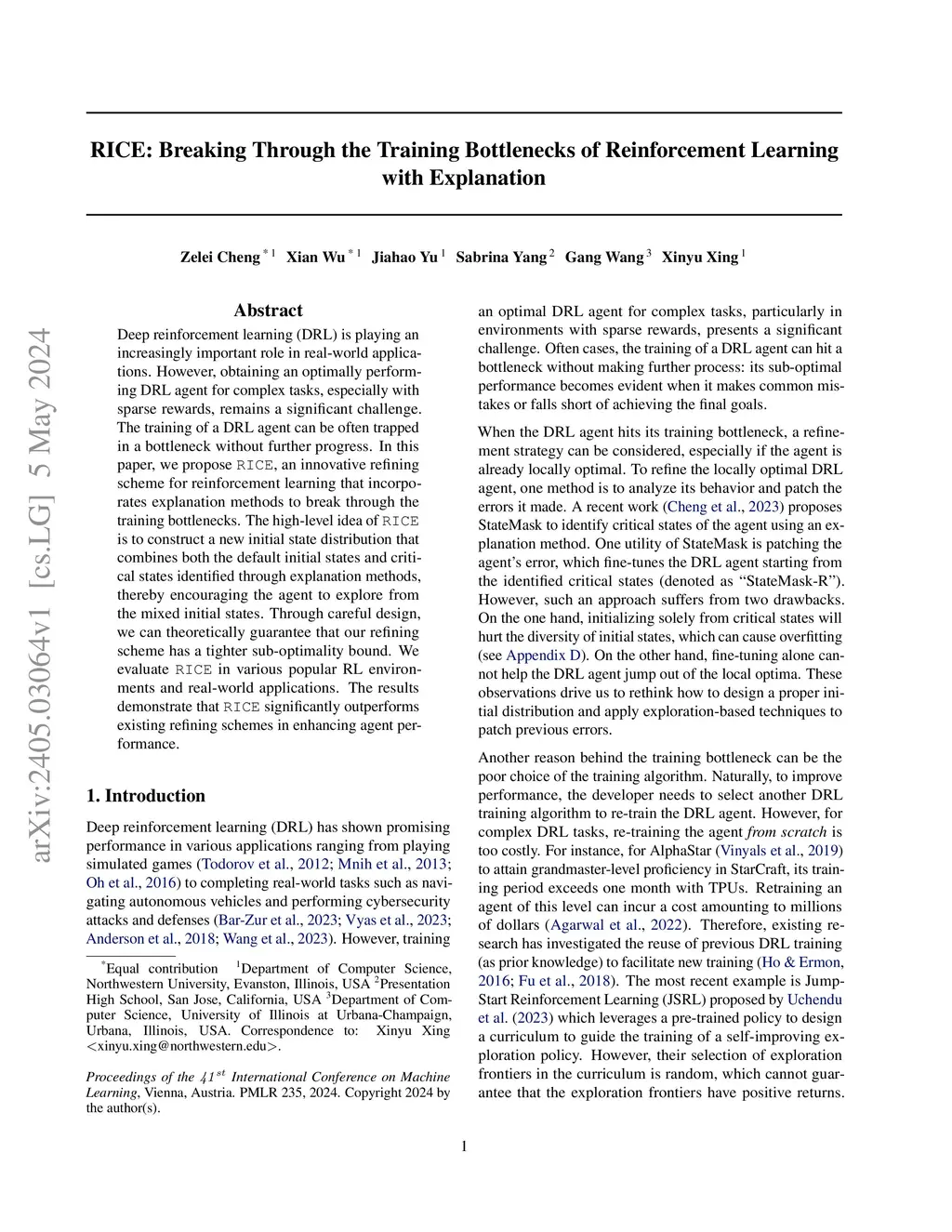 Deep reinforcement learning (DRL) is playing an increasingly important role in real-world applications. However, obtaining an optimally performing DRL agent for complex tasks, especially with sparse rewards, remains a significant challenge. The training of a DRL agent can be often trapped in a bottleneck without further progress. In this paper, we propose RICE, an innovative refining scheme for reinforcement learning that incorporates explanation methods to break through the training bottlenecks. The high-level idea of RICE is to construct a new initial state distribution that combines both the default initial states and critical states identified through explanation methods, thereby encouraging the agent to explore from the mixed initial states. Through careful design, we can theoretically guarantee that our refining scheme has a tighter sub-optimality bound. We evaluate RICE in various popular RL environments and real-world applications. The results demonstrate that RICE significantly outperforms existing refining schemes in enhancing agent performance.