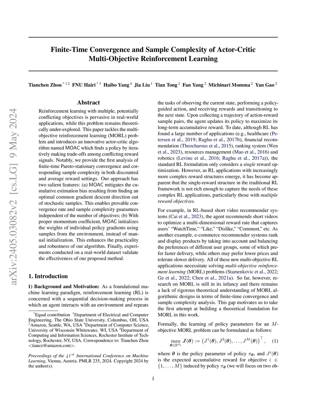 Reinforcement learning with multiple, potentially conflicting objectives is pervasive in real-world applications, while this problem remains theoretically under-explored. This paper tackles the multi-objective reinforcement learning (MORL) problem and introduces an innovative actor-critic algorithm named MOAC which finds a policy by iteratively making trade-offs among conflicting reward signals. Notably, we provide the first analysis of finite-time Pareto-stationary convergence and corresponding sample complexity in both discounted and average reward settings. Our approach has two salient features: (a) MOAC mitigates the cumulative estimation bias resulting from finding an optimal common gradient descent direction out of stochastic samples. This enables provable convergence rate and sample complexity guarantees independent of the number of objectives; (b) With proper momentum coefficient, MOAC initializes the weights of individual policy gradients using samples from the environment, instead of manual initialization. This enhances the practicality and robustness of our algorithm. Finally, experiments conducted on a real-world dataset validate the effectiveness of our proposed method.