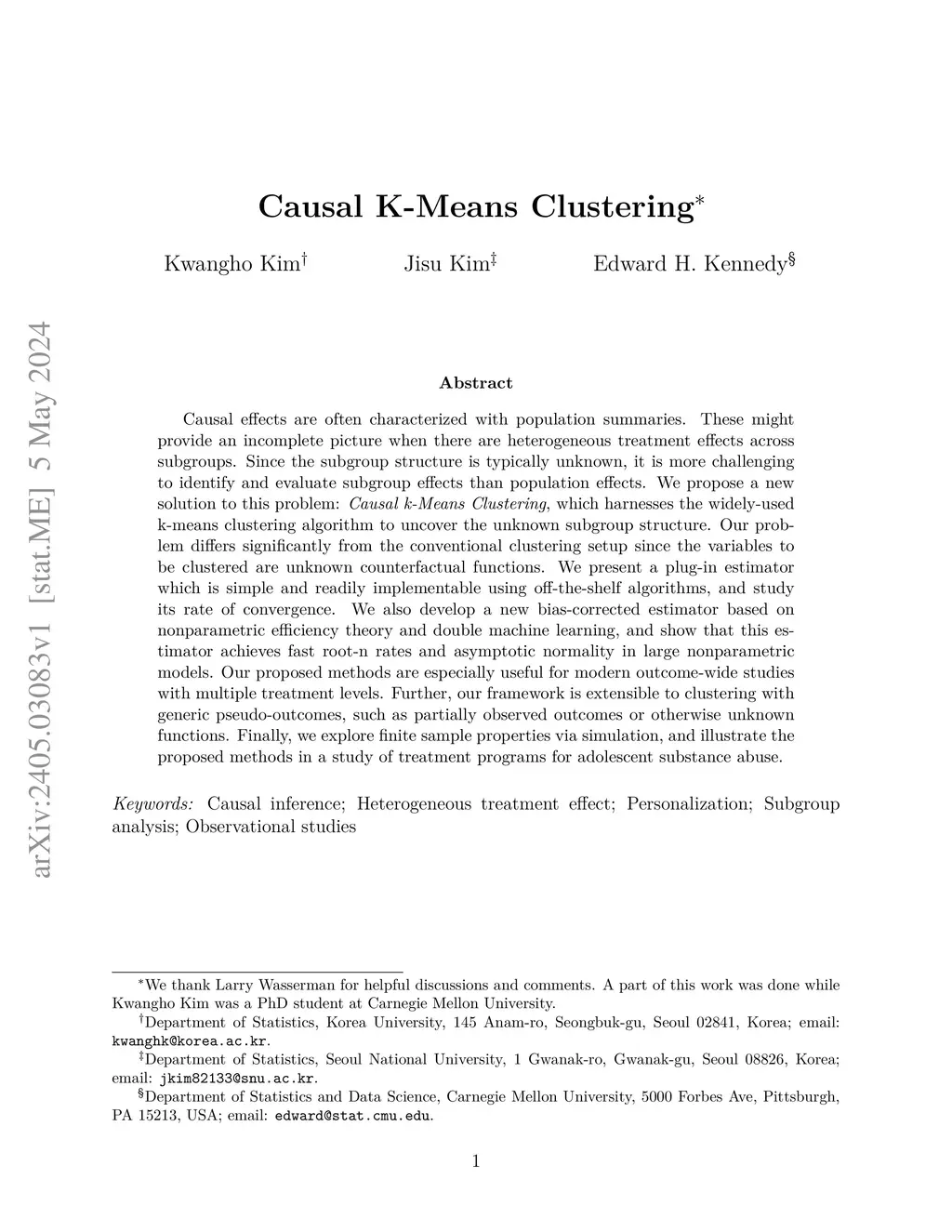 Causal effects are often characterized with population summaries. These might provide an incomplete picture when there are heterogeneous treatment effects across subgroups. Since the subgroup structure is typically unknown, it is more challenging to identify and evaluate subgroup effects than population effects. We propose a new solution to this problem: Causal k-Means Clustering, which harnesses the widely-used k-means clustering algorithm to uncover the unknown subgroup structure. Our problem differs significantly from the conventional clustering setup since the variables to be clustered are unknown counterfactual functions. We present a plug-in estimator which is simple and readily implementable using off-the-shelf algorithms, and study its rate of convergence. We also develop a new bias-corrected estimator based on nonparametric efficiency theory and double machine learning, and show that this estimator achieves fast root-n rates and asymptotic normality in large nonparametric models. Our proposed methods are especially useful for modern outcome-wide studies with multiple treatment levels. Further, our framework is extensible to clustering with generic pseudo-outcomes, such as partially observed outcomes or otherwise unknown functions. Finally, we explore finite sample properties via simulation, and illustrate the proposed methods in a study of treatment programs for adolescent substance abuse.