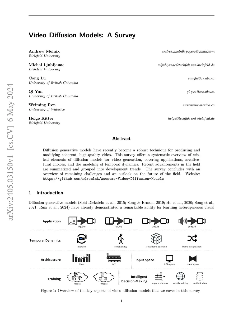Diffusion generative models have recently become a robust technique for producing and modifying coherent, high-quality video. This survey offers a systematic overview of critical elements of diffusion models for video generation, covering applications, architectural choices, and the modeling of temporal dynamics. Recent advancements in the field are summarized and grouped into development trends. The survey concludes with an overview of remaining challenges and an outlook on the future of the field. Website: https://github.com/ndrwmlnk/Awesome-Video-Diffusion-Models