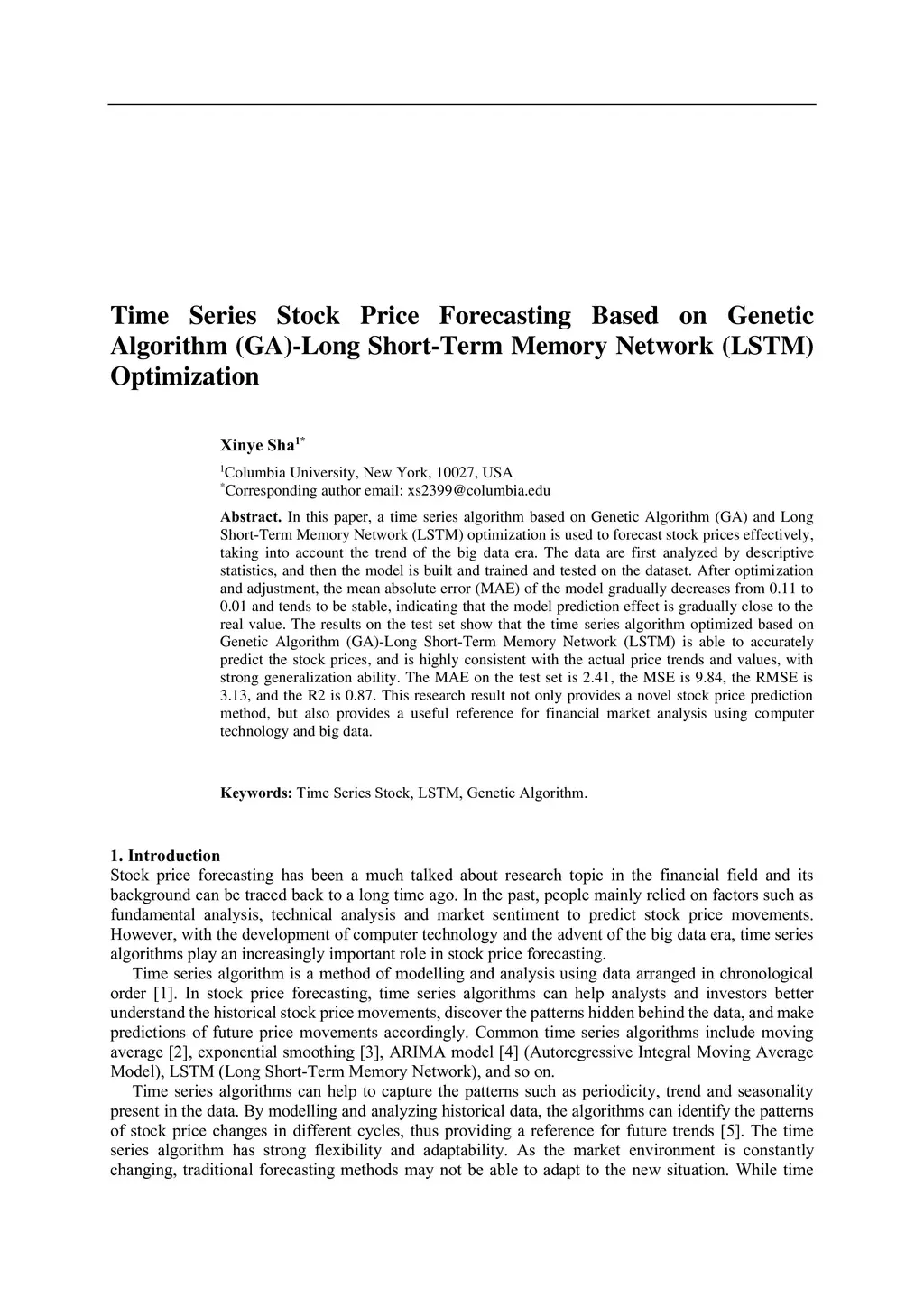 In this paper, a time series algorithm based on Genetic Algorithm (GA) and Long Short-Term Memory Network (LSTM) optimization is used to forecast stock prices effectively, taking into account the trend of the big data era. The data are first analyzed by descriptive statistics, and then the model is built and trained and tested on the dataset. After optimization and adjustment, the mean absolute error (MAE) of the model gradually decreases from 0.11 to 0.01 and tends to be stable, indicating that the model prediction effect is gradually close to the real value. The results on the test set show that the time series algorithm optimized based on Genetic Algorithm (GA)-Long Short-Term Memory Network (LSTM) is able to accurately predict the stock prices, and is highly consistent with the actual price trends and values, with strong generalization ability. The MAE on the test set is 2.41, the MSE is 9.84, the RMSE is 3.13, and the R2 is 0.87. This research result not only provides a novel stock price prediction method, but also provides a useful reference for financial market analysis using computer technology and big data.