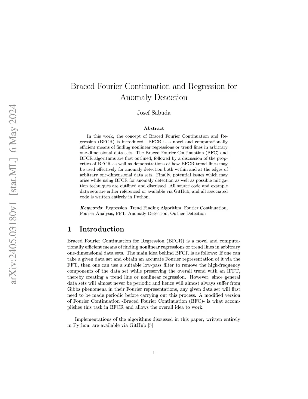 In this work, the concept of Braced Fourier Continuation and Regression (BFCR) is introduced. BFCR is a novel and computationally efficient means of finding nonlinear regressions or trend lines in arbitrary one-dimensional data sets. The Braced Fourier Continuation (BFC) and BFCR algorithms are first outlined, followed by a discussion of the properties of BFCR as well as demonstrations of how BFCR trend lines may be used effectively for anomaly detection both within and at the edges of arbitrary one-dimensional data sets. Finally, potential issues which may arise while using BFCR for anomaly detection as well as possible mitigation techniques are outlined and discussed. All source code and example data sets are either referenced or available via GitHub, and all associated code is written entirely in Python.