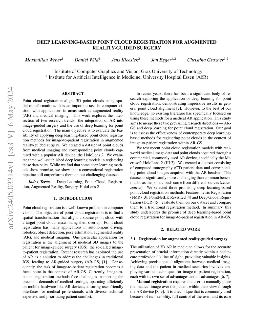 Point cloud registration aligns 3D point clouds using spatial transformations. It is an important task in computer vision, with applications in areas such as augmented reality (AR) and medical imaging. This work explores the intersection of two research trends: the integration of AR into image-guided surgery and the use of deep learning for point cloud registration. The main objective is to evaluate the feasibility of applying deep learning-based point cloud registration methods for image-to-patient registration in augmented reality-guided surgery. We created a dataset of point clouds from medical imaging and corresponding point clouds captured with a popular AR device, the HoloLens 2. We evaluate three well-established deep learning models in registering these data pairs. While we find that some deep learning methods show promise, we show that a conventional registration pipeline still outperforms them on our challenging dataset.