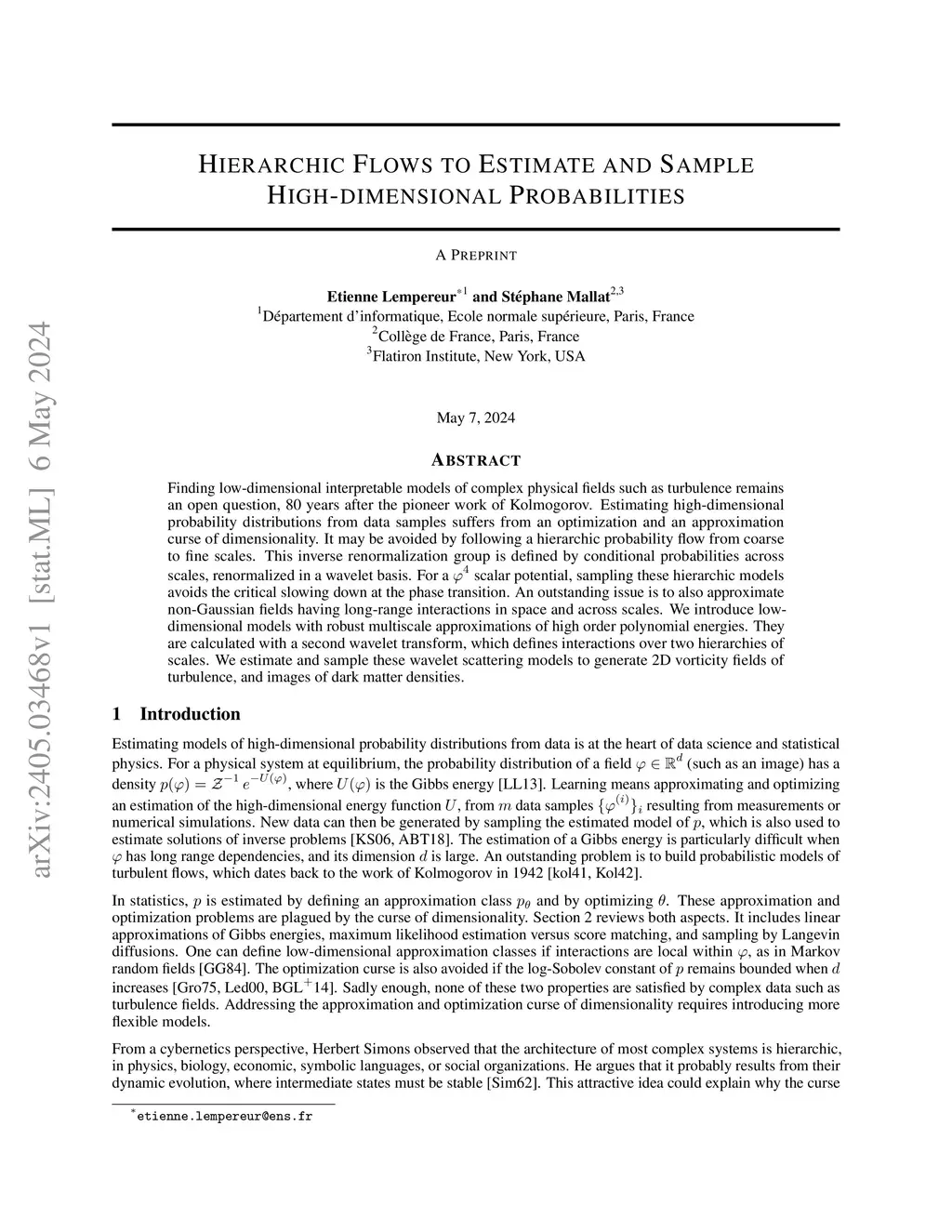 Finding low-dimensional interpretable models of complex physical fields such as turbulence remains an open question, 80 years after the pioneer work of Kolmogorov. Estimating high-dimensional probability distributions from data samples suffers from an optimization and an approximation curse of dimensionality. It may be avoided by following a hierarchic probability flow from coarse to fine scales. This inverse renormalization group is defined by conditional probabilities across scales, renormalized in a wavelet basis. For a scalar potential, sampling these hierarchic models avoids the critical slowing down at the phase transition. In a well chosen wavelet basis, conditional probabilities can be captured with low dimensional parametric models, because interactions between wavelet coefficients are local in space and scales. An outstanding issue is also to approximate non-Gaussian fields having long-range interactions in space and across scales. We introduce low-dimensional models of wavelet conditional probabilities with the scattering covariance. It is calculated with a second wavelet transform, which defines interactions over two hierarchies of scales. We estimate and sample these wavelet scattering models to generate 2D vorticity fields of turbulence, and images of dark matter densities.