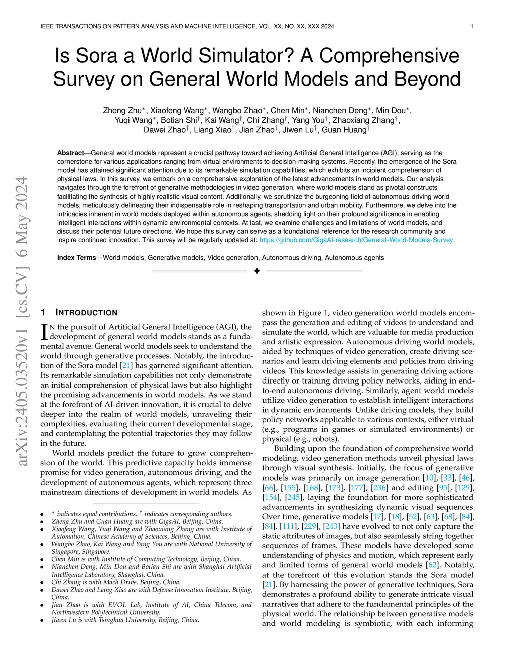General world models represent a crucial pathway toward achieving Artificial General Intelligence (AGI), serving as the cornerstone for various applications ranging from virtual environments to decision-making systems. Recently, the emergence of the Sora model has attained significant attention due to its remarkable simulation capabilities, which exhibits an incipient comprehension of physical laws. In this survey, we embark on a comprehensive exploration of the latest advancements in world models. Our analysis navigates through the forefront of generative methodologies in video generation, where world models stand as pivotal constructs facilitating the synthesis of highly realistic visual content. Additionally, we scrutinize the burgeoning field of autonomous-driving world models, meticulously delineating their indispensable role in reshaping transportation and urban mobility. Furthermore, we delve into the intricacies inherent in world models deployed within autonomous agents, shedding light on their profound significance in enabling intelligent interactions within dynamic environmental contexts. At last, we examine challenges and limitations of world models, and discuss their potential future directions. We hope this survey can serve as a foundational reference for the research community and inspire continued innovation. This survey will be regularly updated at:this https URL.