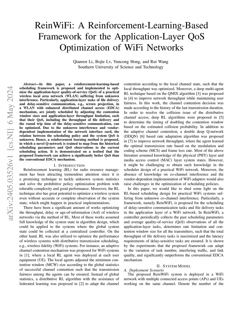The enhanced distributed channel access (EDCA) mechanism is used in current wireless fidelity (WiFi) networks to support priority requirements of heterogeneous applications. However, the EDCA mechanism can not adapt to particular quality-of-service (QoS) objective, network topology, and interference level. In this paper, a novel reinforcement-learning-based scheduling framework is proposed and implemented to optimize the application-layer quality-of-service (QoS) of a WiFi network with commercial adapters and unknown interference. Particularly, application-layer tasks of file delivery and delay-sensitive communication are jointly scheduled by adjusting the contention window sizes and application-layer throughput limitation, such that the throughput of the former and the round trip time of the latter can be optimized. Due to the unknown interference and vendor-dependent implementation of the WiFi adapters, the relation between the scheduling policy and the system QoS is unknown. Hence, a reinforcement learning method is proposed, in which a novel Q-network is trained to map from the historical scheduling parameters and QoS observations to the current scheduling action. It is demonstrated on a testbed that the proposed framework can achieve a significantly better performance than the EDCA mechanism.