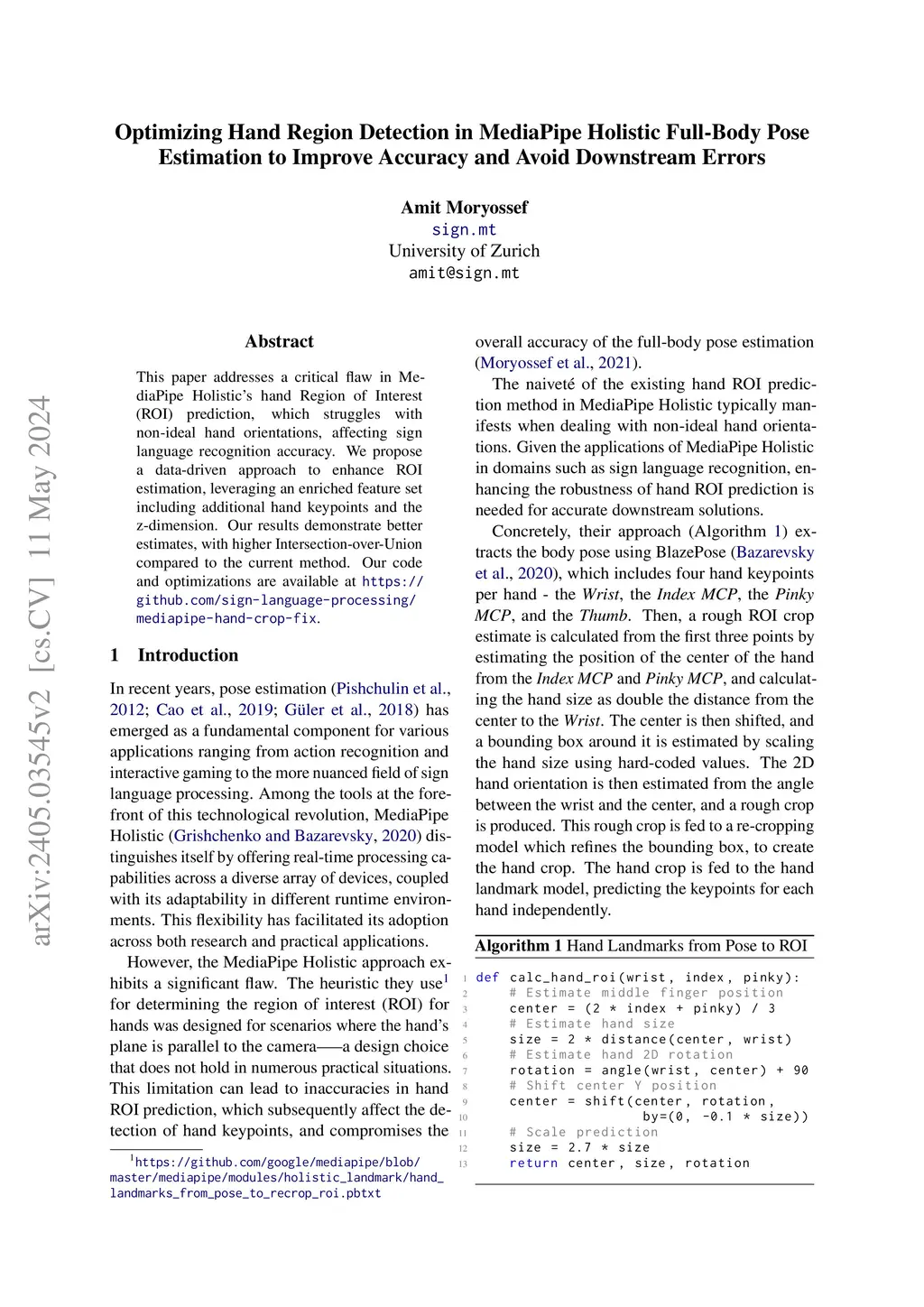 This paper addresses a critical flaw in MediaPipe Holistic's hand Region of Interest (ROI) prediction, which struggles with non-ideal hand orientations, affecting sign language recognition accuracy. We propose a data-driven approach to enhance ROI estimation, leveraging an enriched feature set including additional hand keypoints and the z-dimension. Our results demonstrate better estimates, with higher Intersection-over-Union compared to the current method. Our code and optimizations are available at https://github.com/sign-language-processing/mediapipe-hand-crop-fix.
