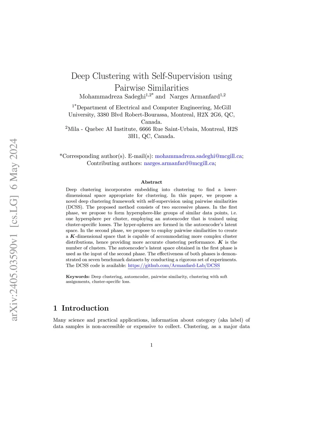 Deep clustering incorporates embedding into clustering to find a lower-dimensional space appropriate for clustering. In this paper, we propose a novel deep clustering framework with self-supervision using pairwise similarities (DCSS). The proposed method consists of two successive phases. In the first phase, we propose to form hypersphere-like groups of similar data points, i.e. one hypersphere per cluster, employing an autoencoder that is trained using cluster-specific losses. The hyper-spheres are formed in the autoencoder's latent space. In the second phase, we propose to employ pairwise similarities to create a -dimensional space that is capable of accommodating more complex cluster distributions, hence providing more accurate clustering performance. is the number of clusters. The autoencoder's latent space obtained in the first phase is used as the input of the second phase. The effectiveness of both phases is demonstrated on seven benchmark datasets by conducting a rigorous set of experiments.
