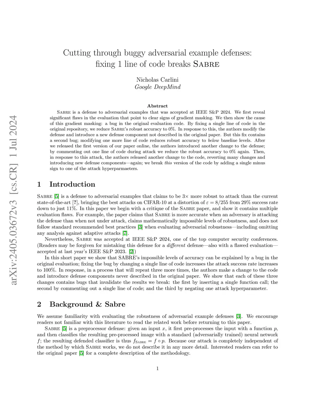Sabre is a defense to adversarial examples that was accepted at IEEE S&P 2024. We first reveal significant flaws in the evaluation that point to clear signs of gradient masking. We then show the cause of this gradient masking: a bug in the original evaluation code. By fixing a single line of code in the original repository, we reduce Sabre's robust accuracy to 0%. In response to this, the authors modify the defense and introduce a new defense component not described in the original paper. But this fix contains a second bug; modifying one more line of code reduces robust accuracy to below baseline levels. After we released the first version of our paper online, the authors introduced another change to the defense; by commenting out one line of code during attack we reduce the robust accuracy to 0% again.