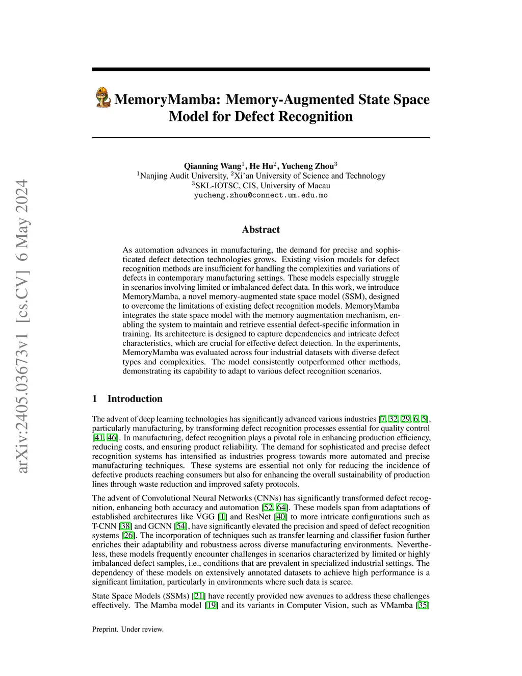 As automation advances in manufacturing, the demand for precise and sophisticated defect detection technologies grows. Existing vision models for defect recognition methods are insufficient for handling the complexities and variations of defects in contemporary manufacturing settings. These models especially struggle in scenarios involving limited or imbalanced defect data. In this work, we introduce MemoryMamba, a novel memory-augmented state space model (SSM), designed to overcome the limitations of existing defect recognition models. MemoryMamba integrates the state space model with the memory augmentation mechanism, enabling the system to maintain and retrieve essential defect-specific information in training. Its architecture is designed to capture dependencies and intricate defect characteristics, which are crucial for effective defect detection. In the experiments, MemoryMamba was evaluated across four industrial datasets with diverse defect types and complexities. The model consistently outperformed other methods, demonstrating its capability to adapt to various defect recognition scenarios.