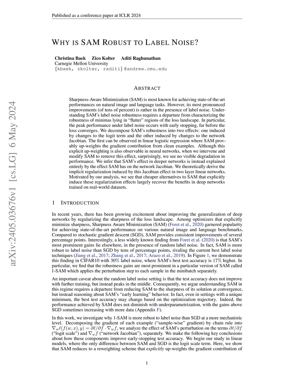 Sharpness-Aware Minimization (SAM) is most known for achieving state-of the-art performances on natural image and language tasks. However, its most pronounced improvements (of tens of percent) is rather in the presence of label noise. Understanding SAM's label noise robustness requires a departure from characterizing the robustness of minimas lying in "flatter" regions of the loss landscape. In particular, the peak performance under label noise occurs with early stopping, far before the loss converges. We decompose SAM's robustness into two effects: one induced by changes to the logit term and the other induced by changes to the network Jacobian. The first can be observed in linear logistic regression where SAM provably up-weights the gradient contribution from clean examples. Although this explicit up-weighting is also observable in neural networks, when we intervene and modify SAM to remove this effect, surprisingly, we see no visible degradation in performance. We infer that SAM's effect in deeper networks is instead explained entirely by the effect SAM has on the network Jacobian. We theoretically derive the implicit regularization induced by this Jacobian effect in two layer linear networks. Motivated by our analysis, we see that cheaper alternatives to SAM that explicitly induce these regularization effects largely recover the benefits in deep networks trained on real-world datasets.