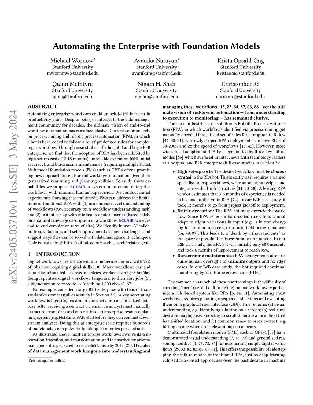 Automating enterprise workflows could unlock $4 trillion/year in productivity gains. Despite being of interest to the data management community for decades, the ultimate vision of end-to-end workflow automation has remained elusive. Current solutions rely on process mining and robotic process automation (RPA), in which a bot is hard-coded to follow a set of predefined rules for completing a workflow. Through case studies of a hospital and large B2B enterprise, we find that the adoption of RPA has been inhibited by high set-up costs (12-18 months), unreliable execution (60% initial accuracy), and burdensome maintenance (requiring multiple FTEs). Multimodal foundation models (FMs) such as GPT-4 offer a promising new approach for end-to-end workflow automation given their generalized reasoning and planning abilities. To study these capabilities we propose ECLAIR, a system to automate enterprise workflows with minimal human supervision. We conduct initial experiments showing that multimodal FMs can address the limitations of traditional RPA with (1) near-human-level understanding of workflows (93% accuracy on a workflow understanding task) and (2) instant set-up with minimal technical barrier (based solely on a natural language description of a workflow, ECLAIR achieves end-to-end completion rates of 40%). We identify human-AI collaboration, validation, and self-improvement as open challenges, and suggest ways they can be solved with data management techniques. Code is available at: https://github.com/HazyResearch/eclair-agents