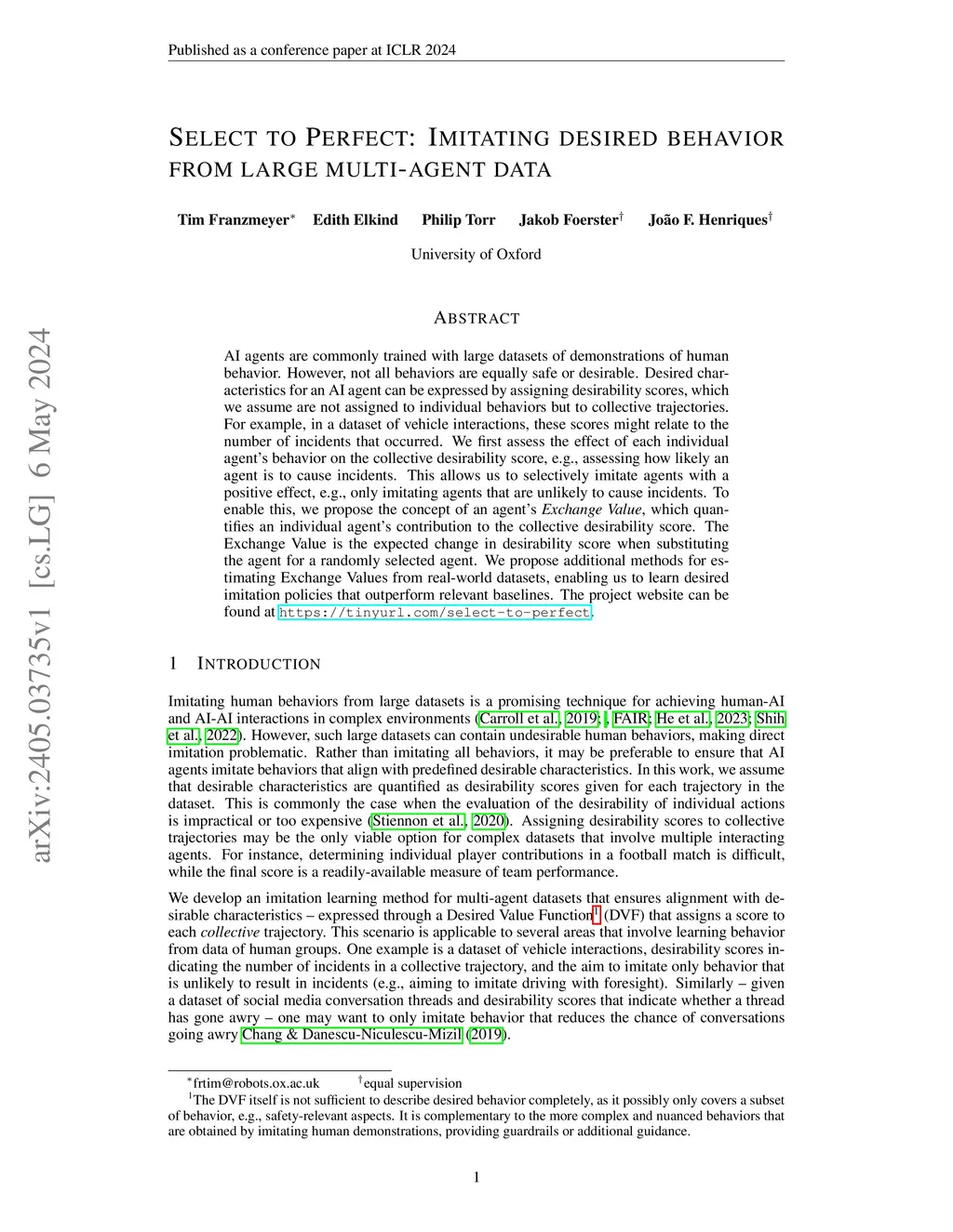 AI agents are commonly trained with large datasets of demonstrations of human behavior. However, not all behaviors are equally safe or desirable. Desired characteristics for an AI agent can be expressed by assigning desirability scores, which we assume are not assigned to individual behaviors but to collective trajectories. For example, in a dataset of vehicle interactions, these scores might relate to the number of incidents that occurred. We first assess the effect of each individual agent's behavior on the collective desirability score, e.g., assessing how likely an agent is to cause incidents. This allows us to selectively imitate agents with a positive effect, e.g., only imitating agents that are unlikely to cause incidents. To enable this, we propose the concept of an agent's Exchange Value, which quantifies an individual agent's contribution to the collective desirability score. The Exchange Value is the expected change in desirability score when substituting the agent for a randomly selected agent. We propose additional methods for estimating Exchange Values from real-world datasets, enabling us to learn desired imitation policies that outperform relevant baselines. The project website can be found at https://tinyurl.com/select-to-perfect.