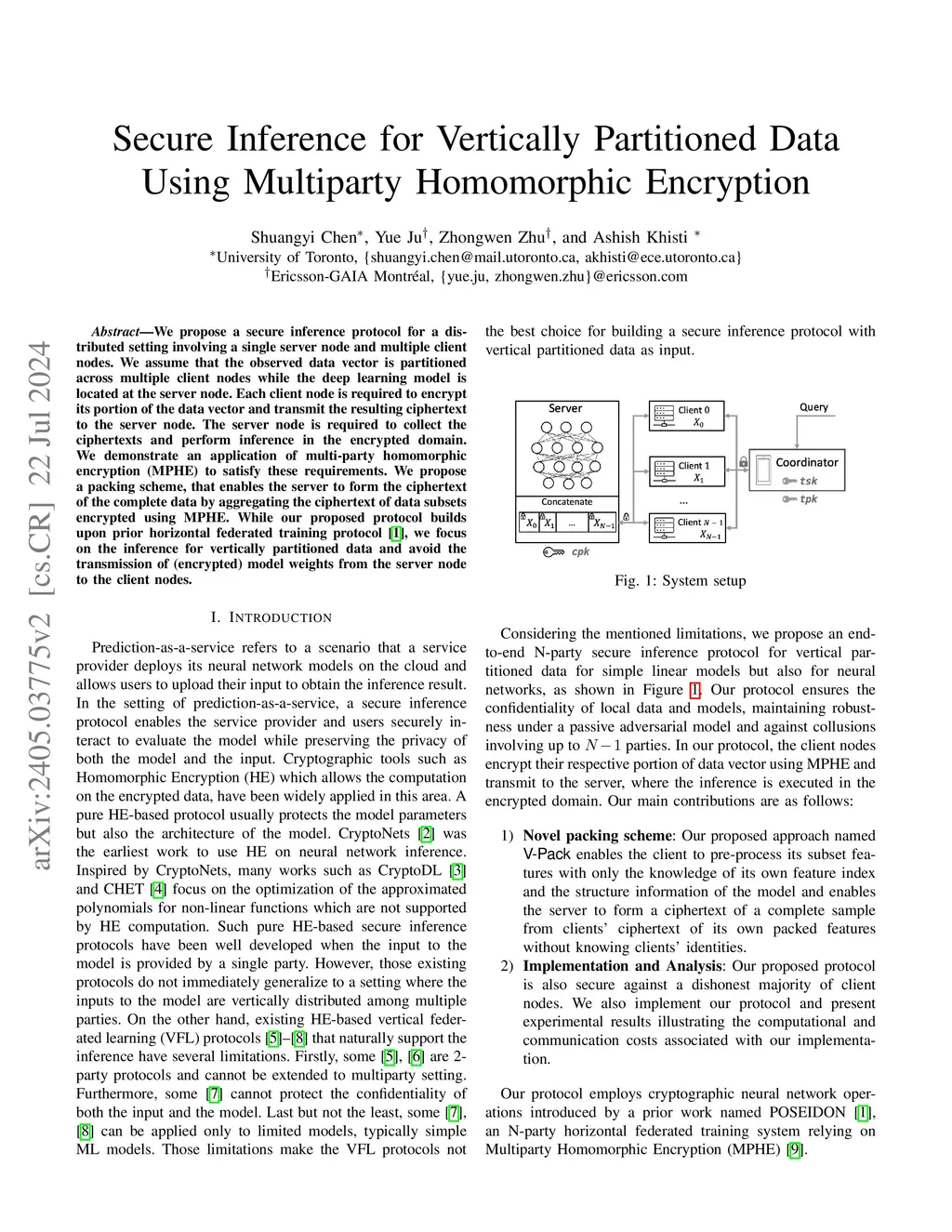 Secure Inference for Vertically Partitioned Data Using Multiparty