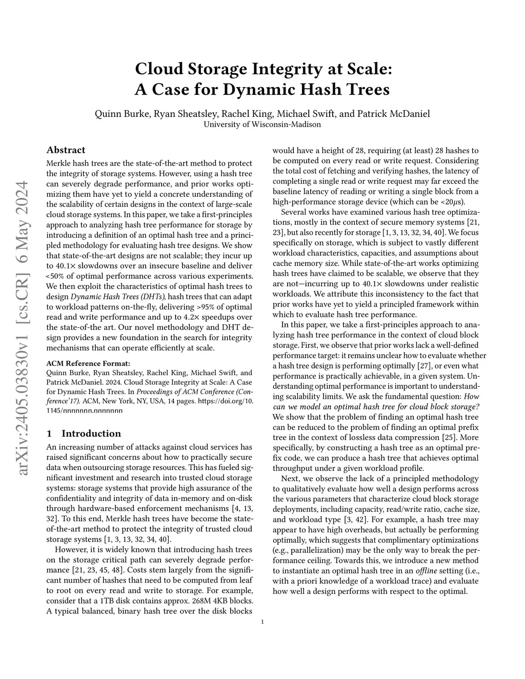 Merkle hash trees are the standard method to protect the integrity and freshness of stored data. However, hash trees introduce additional compute and I/O costs on the I/O critical path, and prior efforts have not fully characterized these costs. In this paper, we quantify performance overheads of storage-level hash trees in realistic settings. We then design an optimized tree structure called Dynamic Merkle Trees (DMTs) based on an analysis of root causes of overheads. DMTs exploit patterns in workloads to deliver up to a 2.2x throughput and latency improvement over the state of the art. Our novel approach provides a promising new direction to achieve integrity guarantees in storage efficiently and at scale.