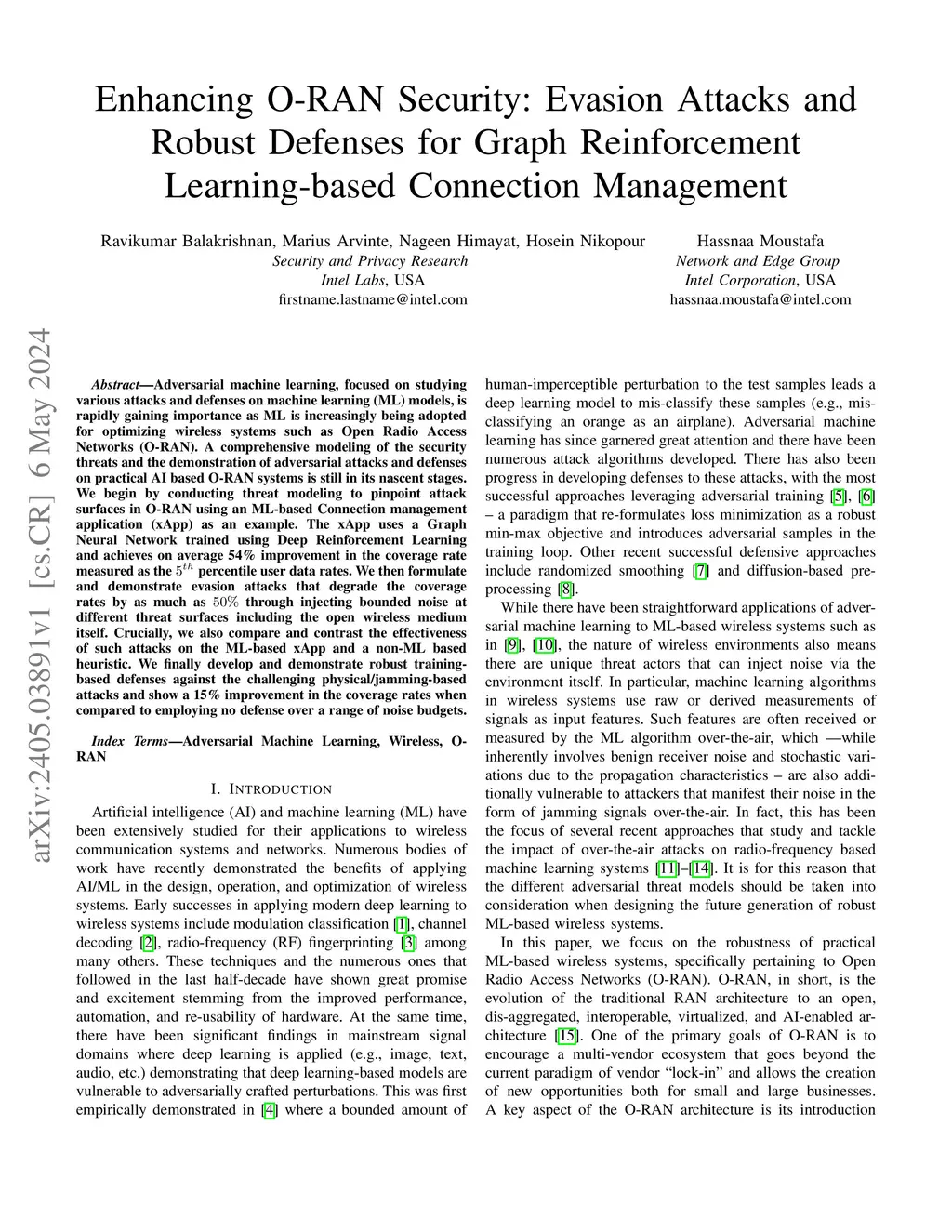 Adversarial machine learning, focused on studying various attacks and defenses on machine learning (ML) models, is rapidly gaining importance as ML is increasingly being adopted for optimizing wireless systems such as Open Radio Access Networks (O-RAN). A comprehensive modeling of the security threats and the demonstration of adversarial attacks and defenses on practical AI based O-RAN systems is still in its nascent stages. We begin by conducting threat modeling to pinpoint attack surfaces in O-RAN using an ML-based Connection management application (xApp) as an example. The xApp uses a Graph Neural Network trained using Deep Reinforcement Learning and achieves on average 54% improvement in the coverage rate measured as the 5th percentile user data rates. We then formulate and demonstrate evasion attacks that degrade the coverage rates by as much as 50% through injecting bounded noise at different threat surfaces including the open wireless medium itself. Crucially, we also compare and contrast the effectiveness of such attacks on the ML-based xApp and a non-ML based heuristic. We finally develop and demonstrate robust training-based defenses against the challenging physical/jamming-based attacks and show a 15% improvement in the coverage rates when compared to employing no defense over a range of noise budgets