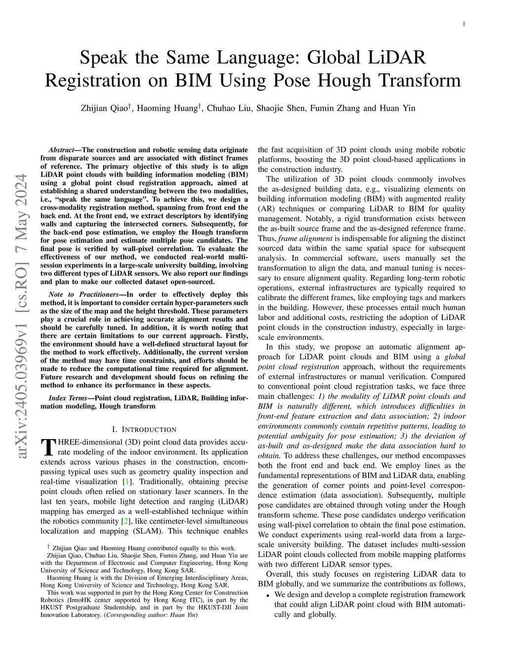 Light detection and ranging (LiDAR) point clouds and building information modeling (BIM) represent two distinct data modalities in the fields of robot perception and construction. These modalities originate from different sources and are associated with unique reference frames. The primary goal of this study is to align these modalities within a shared reference frame using a global registration approach, effectively enabling them to ``speak the same language''. To achieve this, we propose a cross-modality registration method, spanning from the front end to the back end. At the front end, we extract triangle descriptors by identifying walls and intersected corners, enabling the matching of corner triplets with a complexity independent of the BIM's size. For the back-end transformation estimation, we utilize the Hough transform to map the matched triplets to the transformation space and introduce a hierarchical voting mechanism to hypothesize multiple pose candidates. The final transformation is then verified using our designed occupancy-aware scoring method. To assess the effectiveness of our approach, we conducted real-world multi-session experiments in a large-scale university building, employing two different types of LiDAR sensors. We make the collected datasets and codes publicly available to benefit the community.