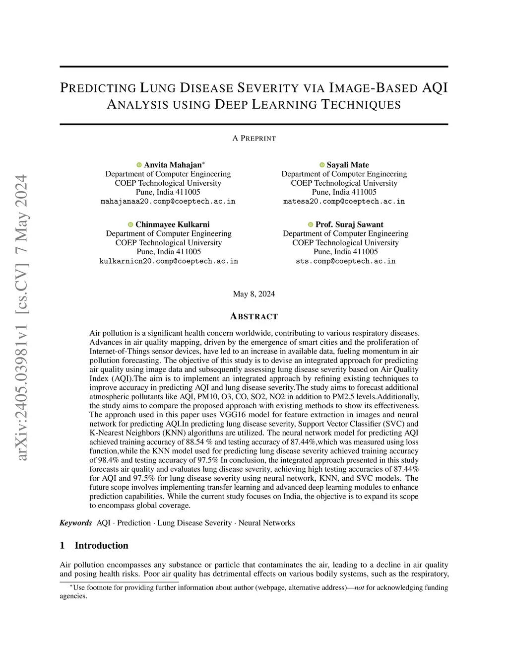 Air pollution is a significant health concern worldwide, contributing to various respiratory diseases. Advances in air quality mapping, driven by the emergence of smart cities and the proliferation of Internet-of-Things sensor devices, have led to an increase in available data, fueling momentum in air pollution forecasting. The objective of this study is to devise an integrated approach for predicting air quality using image data and subsequently assessing lung disease severity based on Air Quality Index (AQI).The aim is to implement an integrated approach by refining existing techniques to improve accuracy in predicting AQI and lung disease severity. The study aims to forecast additional atmospheric pollutants like AQI, PM10, O3, CO, SO2, NO2 in addition to PM2.5 levels. Additionally, the study aims to compare the proposed approach with existing methods to show its effectiveness. The approach used in this paper uses VGG16 model for feature extraction in images and neural network for predicting AQI.In predicting lung disease severity, Support Vector Classifier (SVC) and K-Nearest Neighbors (KNN) algorithms are utilized. The neural network model for predicting AQI achieved training accuracy of 88.54 % and testing accuracy of 87.44%,which was measured using loss function, while the KNN model used for predicting lung disease severity achieved training accuracy of 98.4% and testing accuracy of 97.5% In conclusion, the integrated approach presented in this study forecasts air quality and evaluates lung disease severity, achieving high testing accuracies of 87.44% for AQI and 97.5% for lung disease severity using neural network, KNN, and SVC models. The future scope involves implementing transfer learning and advanced deep learning modules to enhance prediction capabilities. While the current study focuses on India, the objective is to expand its scope to encompass global coverage.