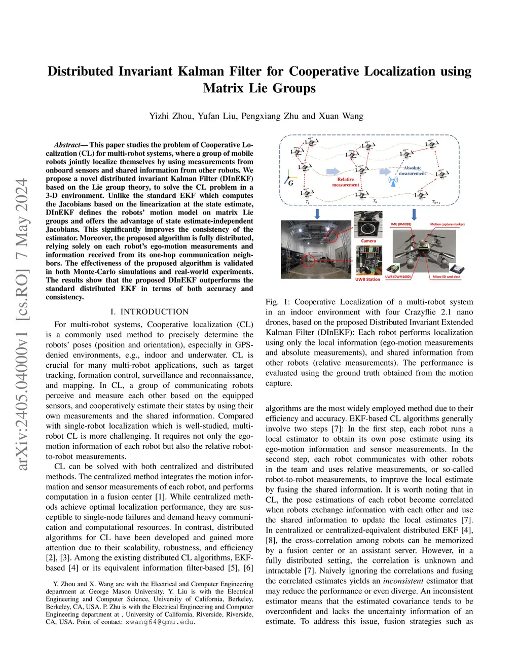 This paper studies the problem of Cooperative Localization (CL) for multi-robot systems, where a group of mobile robots jointly localize themselves by using measurements from onboard sensors and shared information from other robots. We propose a novel distributed invariant Kalman Filter (DInEKF) based on the Lie group theory, to solve the CL problem in a 3-D environment. Unlike the standard EKF which computes the Jacobians based on the linearization at the state estimate, DInEKF defines the robots' motion model on matrix Lie groups and offers the advantage of state estimate-independent Jacobians. This significantly improves the consistency of the estimator. Moreover, the proposed algorithm is fully distributed, relying solely on each robot's ego-motion measurements and information received from its one-hop communication neighbors. The effectiveness of the proposed algorithm is validated in both Monte-Carlo simulations and real-world experiments. The results show that the proposed DInEKF outperforms the standard distributed EKF in terms of both accuracy and consistency.
