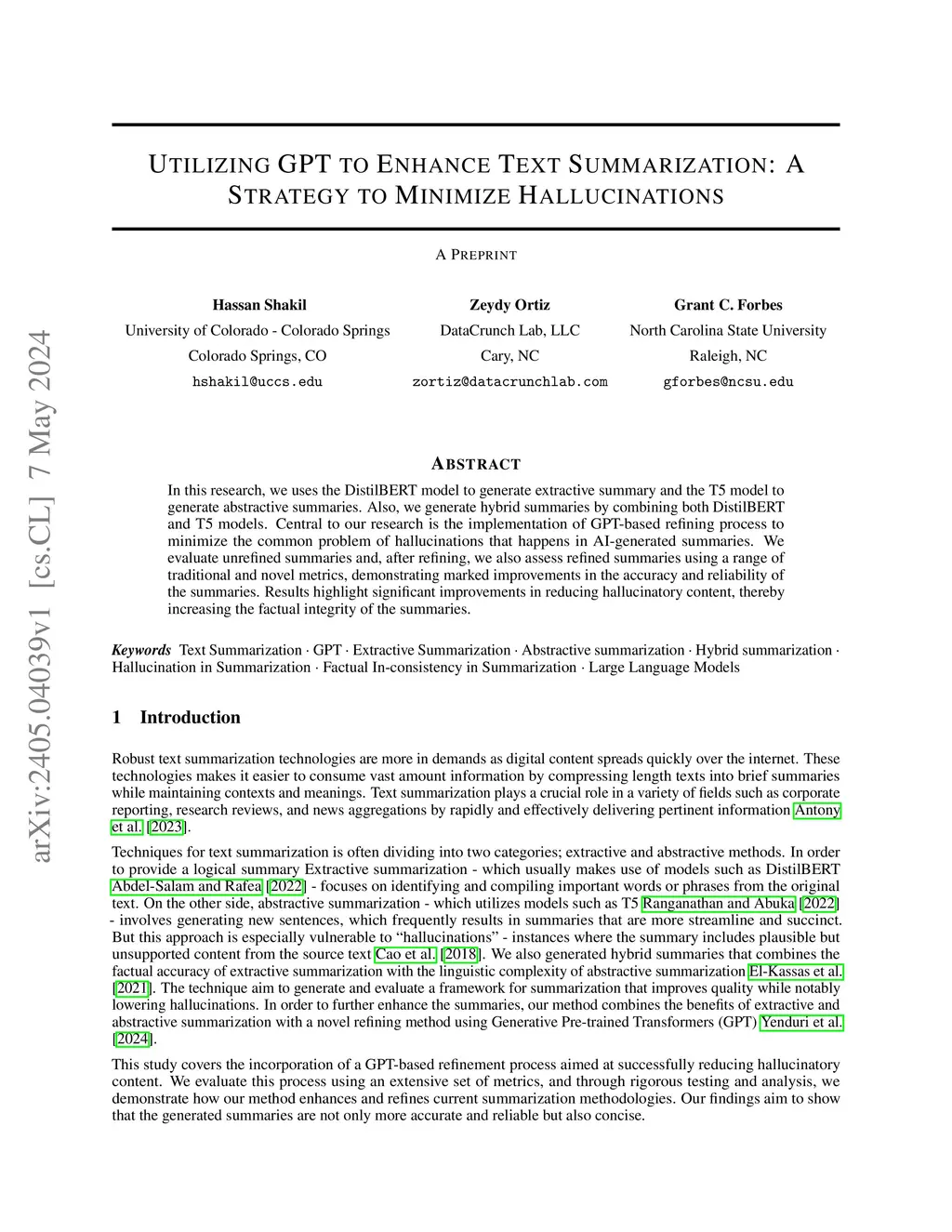 In this research, we uses the DistilBERT model to generate extractive summary and the T5 model to generate abstractive summaries. Also, we generate hybrid summaries by combining both DistilBERT and T5 models. Central to our research is the implementation of GPT-based refining process to minimize the common problem of hallucinations that happens in AI-generated summaries. We evaluate unrefined summaries and, after refining, we also assess refined summaries using a range of traditional and novel metrics, demonstrating marked improvements in the accuracy and reliability of the summaries. Results highlight significant improvements in reducing hallucinatory content, thereby increasing the factual integrity of the summaries.