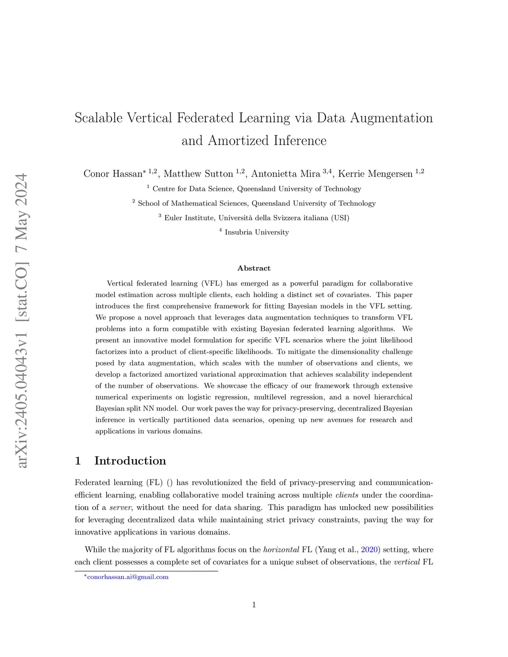 Vertical federated learning (VFL) has emerged as a paradigm for collaborative model estimation across multiple clients, each holding a distinct set of covariates. This paper introduces the first comprehensive framework for fitting Bayesian models in the VFL setting. We propose a novel approach that leverages data augmentation techniques to transform VFL problems into a form compatible with existing Bayesian federated learning algorithms. We present an innovative model formulation for specific VFL scenarios where the joint likelihood factorizes into a product of client-specific likelihoods. To mitigate the dimensionality challenge posed by data augmentation, which scales with the number of observations and clients, we develop a factorized amortized variational approximation that achieves scalability independent of the number of observations. We showcase the efficacy of our framework through extensive numerical experiments on logistic regression, multilevel regression, and a novel hierarchical Bayesian split neural net model. Our work paves the way for privacy-preserving, decentralized Bayesian inference in vertically partitioned data scenarios, opening up new avenues for research and applications in various domains.
