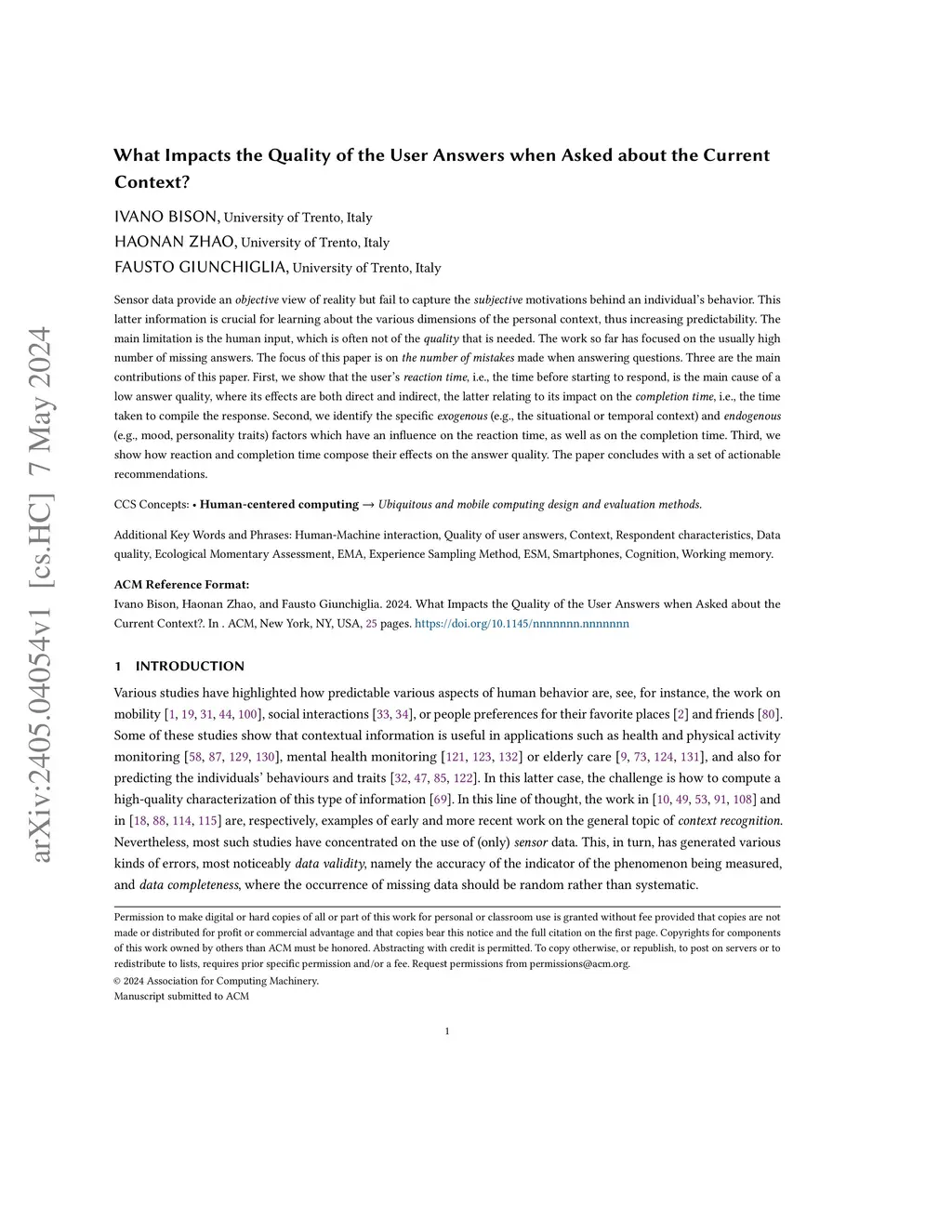 Sensor data provide an objective view of reality but fail to capture the subjective motivations behind an individual's behavior. This latter information is crucial for learning about the various dimensions of the personal context, thus increasing predictability. The main limitation is the human input, which is often not of the quality that is needed. The work so far has focused on the usually high number of missing answers. The focus of this paper is on \textit{the number of mistakes} made when answering questions. Three are the main contributions of this paper. First, we show that the user's reaction time, i.e., the time before starting to respond, is the main cause of a low answer quality, where its effects are both direct and indirect, the latter relating to its impact on the completion time, i.e., the time taken to compile the response. Second, we identify the specific exogenous (e.g., the situational or temporal context) and endogenous (e.g., mood, personality traits) factors which have an influence on the reaction time, as well as on the completion time. Third, we show how reaction and completion time compose their effects on the answer quality. The paper concludes with a set of actionable recommendations.