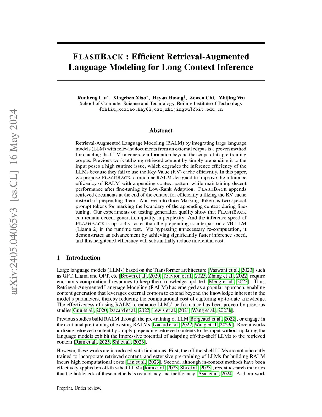 Retrieval-Augmented Language Modeling (RALM) by integrating large language models (LLM) with relevant documents from an external corpus is a proven method for enabling the LLM to generate information beyond the scope of its pre-training corpus. Previous work utilizing retrieved content by simply prepending it to the input poses a high runtime issue, which degrades the inference efficiency of the LLMs because they fail to use the Key-Value (KV) cache efficiently. In this paper, we propose FlashBack, a modular RALM designed to improve the inference efficiency of RALM with appending context pattern while maintaining decent performance after fine-tuning by Low-Rank Adaption. FlashBack appends retrieved documents at the end of the context for efficiently utilizing the KV cache instead of prepending them. And we introduce Marking Token as two special prompt tokens for marking the boundary of the appending context during fine-tuning. Our experiments on testing generation quality show that FlashBack can remain decent generation quality in perplexity. And the inference speed of FlashBack is up to faster than the prepending counterpart on a 7B LLM (Llama 2) in the runtime test. Via bypassing unnecessary re-computation, it demonstrates an advancement by achieving significantly faster inference speed, and this heightened efficiency will substantially reduce inferential cost.
