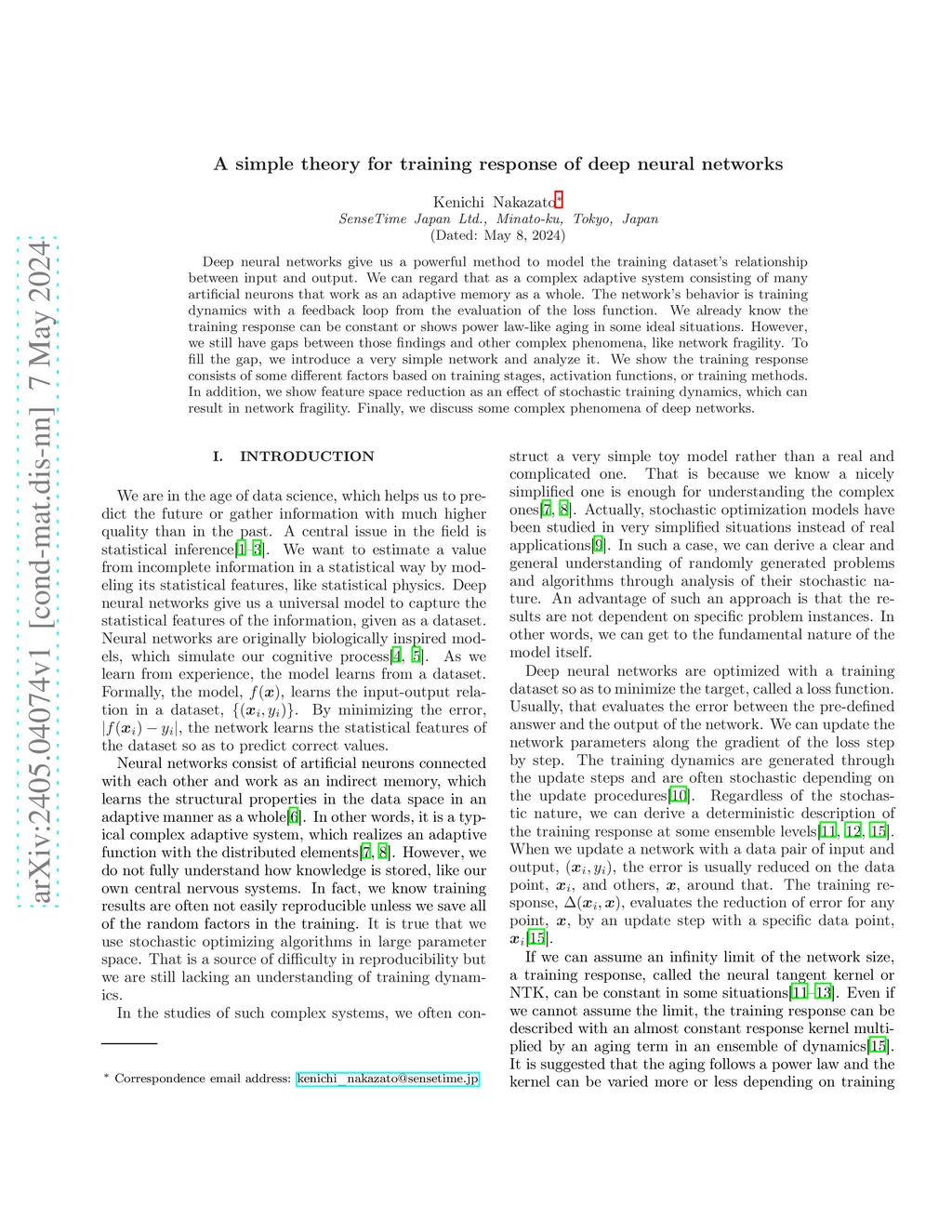 Deep neural networks give us a powerful method to model the training dataset's relationship between input and output. We can regard that as a complex adaptive system consisting of many artificial neurons that work as an adaptive memory as a whole. The network's behavior is training dynamics with a feedback loop from the evaluation of the loss function. We already know the training response can be constant or shows power law-like aging in some ideal situations. However, we still have gaps between those findings and other complex phenomena, like network fragility. To fill the gap, we introduce a very simple network and analyze it. We show the training response consists of some different factors based on training stages, activation functions, or training methods. In addition, we show feature space reduction as an effect of stochastic training dynamics, which can result in network fragility. Finally, we discuss some complex phenomena of deep networks.