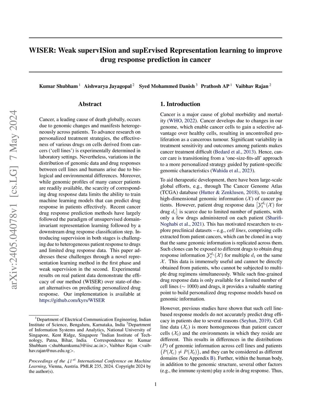 Cancer, a leading cause of death globally, occurs due to genomic changes and manifests heterogeneously across patients. To advance research on personalized treatment strategies, the effectiveness of various drugs on cells derived from cancers (`cell lines') is experimentally determined in laboratory settings. Nevertheless, variations in the distribution of genomic data and drug responses between cell lines and humans arise due to biological and environmental differences. Moreover, while genomic profiles of many cancer patients are readily available, the scarcity of corresponding drug response data limits the ability to train machine learning models that can predict drug response in patients effectively. Recent cancer drug response prediction methods have largely followed the paradigm of unsupervised domain-invariant representation learning followed by a downstream drug response classification step. Introducing supervision in both stages is challenging due to heterogeneous patient response to drugs and limited drug response data. This paper addresses these challenges through a novel representation learning method in the first phase and weak supervision in the second. Experimental results on real patient data demonstrate the efficacy of our method (WISER) over state-of-the-art alternatives on predicting personalized drug response.
