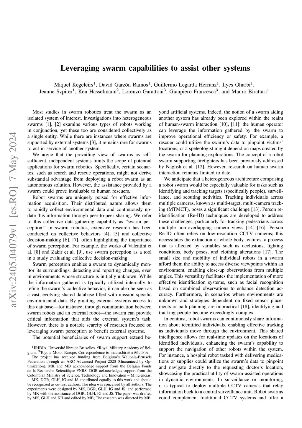 Most studies in swarm robotics treat the swarm as an isolated system of interest. We argue that the prevailing view of swarms as self-sufficient, independent systems limits the scope of potential applications for swarm robotics. A robot swarm could act as a support in an heterogeneous system comprising other robots and/or human operators, in particular by quickly providing access to a large amount of data acquired in large unknown environments. Tasks such as target identification & tracking, scouting, or monitoring/surveillance could benefit from this approach.