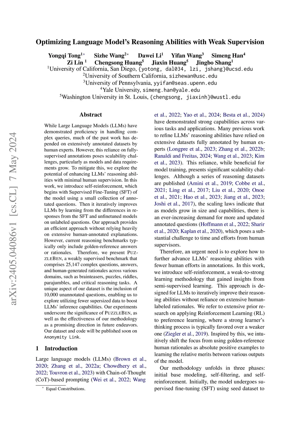 While Large Language Models (LLMs) have demonstrated proficiency in handling complex queries, much of the past work has depended on extensively annotated datasets by human experts. However, this reliance on fully-supervised annotations poses scalability challenges, particularly as models and data requirements grow. To mitigate this, we explore the potential of enhancing LLMs' reasoning abilities with minimal human supervision. In this work, we introduce self-reinforcement, which begins with Supervised Fine-Tuning (SFT) of the model using a small collection of annotated questions. Then it iteratively improves LLMs by learning from the differences in responses from the SFT and unfinetuned models on unlabeled questions. Our approach provides an efficient approach without relying heavily on extensive human-annotated explanations. However, current reasoning benchmarks typically only include golden-reference answers or rationales. Therefore, we present \textsc{PuzzleBen}, a weakly supervised benchmark that comprises 25,147 complex questions, answers, and human-generated rationales across various domains, such as brainteasers, puzzles, riddles, parajumbles, and critical reasoning tasks. A unique aspect of our dataset is the inclusion of 10,000 unannotated questions, enabling us to explore utilizing fewer supersized data to boost LLMs' inference capabilities. Our experiments underscore the significance of \textsc{PuzzleBen}, as well as the effectiveness of our methodology as a promising direction in future endeavors. Our dataset and code will be published soon on \texttt{Anonymity Link}.