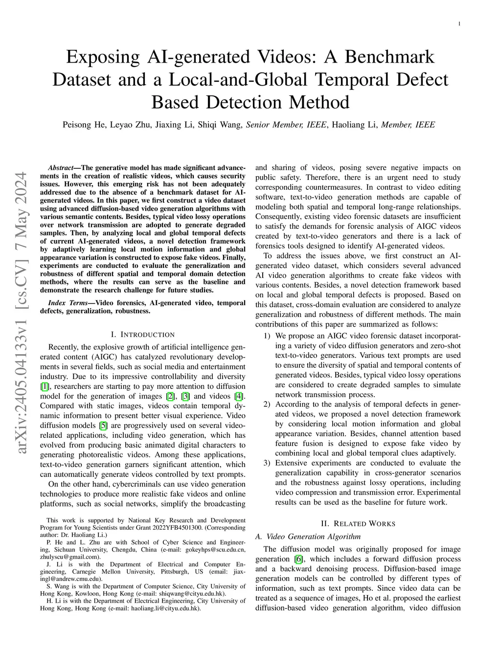The generative model has made significant advancements in the creation of realistic videos, which causes security issues. However, this emerging risk has not been adequately addressed due to the absence of a benchmark dataset for AI-generated videos. In this paper, we first construct a video dataset using advanced diffusion-based video generation algorithms with various semantic contents. Besides, typical video lossy operations over network transmission are adopted to generate degraded samples. Then, by analyzing local and global temporal defects of current AI-generated videos, a novel detection framework by adaptively learning local motion information and global appearance variation is constructed to expose fake videos. Finally, experiments are conducted to evaluate the generalization and robustness of different spatial and temporal domain detection methods, where the results can serve as the baseline and demonstrate the research challenge for future studies.