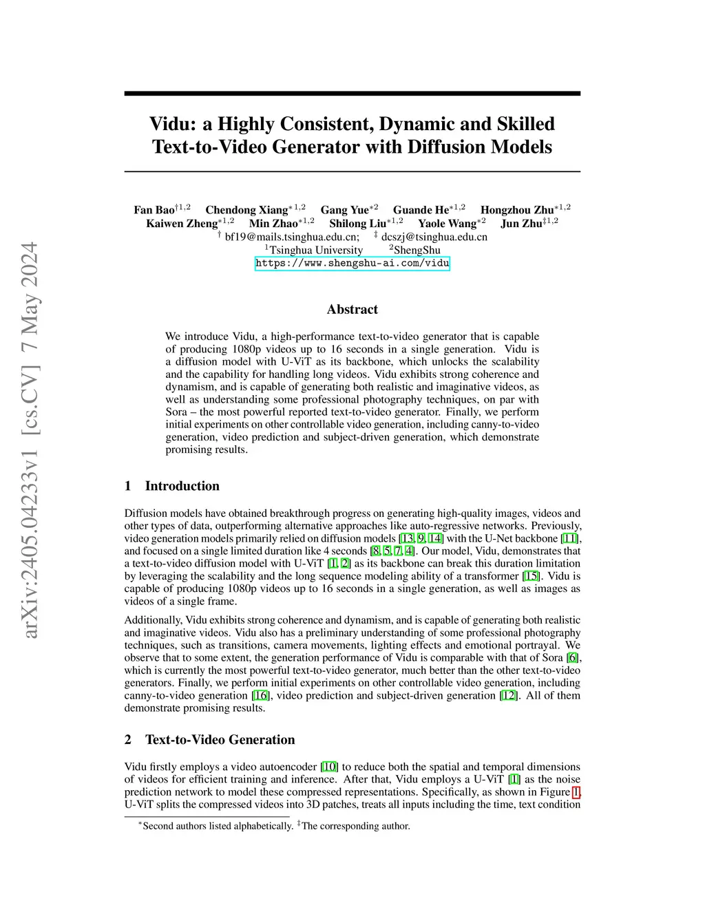 We introduce Vidu, a high-performance text-to-video generator that is capable of producing 1080p videos up to 16 seconds in a single generation. Vidu is a diffusion model with U-ViT as its backbone, which unlocks the scalability and the capability for handling long videos. Vidu exhibits strong coherence and dynamism, and is capable of generating both realistic and imaginative videos, as well as understanding some professional photography techniques, on par with Sora -- the most powerful reported text-to-video generator. Finally, we perform initial experiments on other controllable video generation, including canny-to-video generation, video prediction and subject-driven generation, which demonstrate promising results.