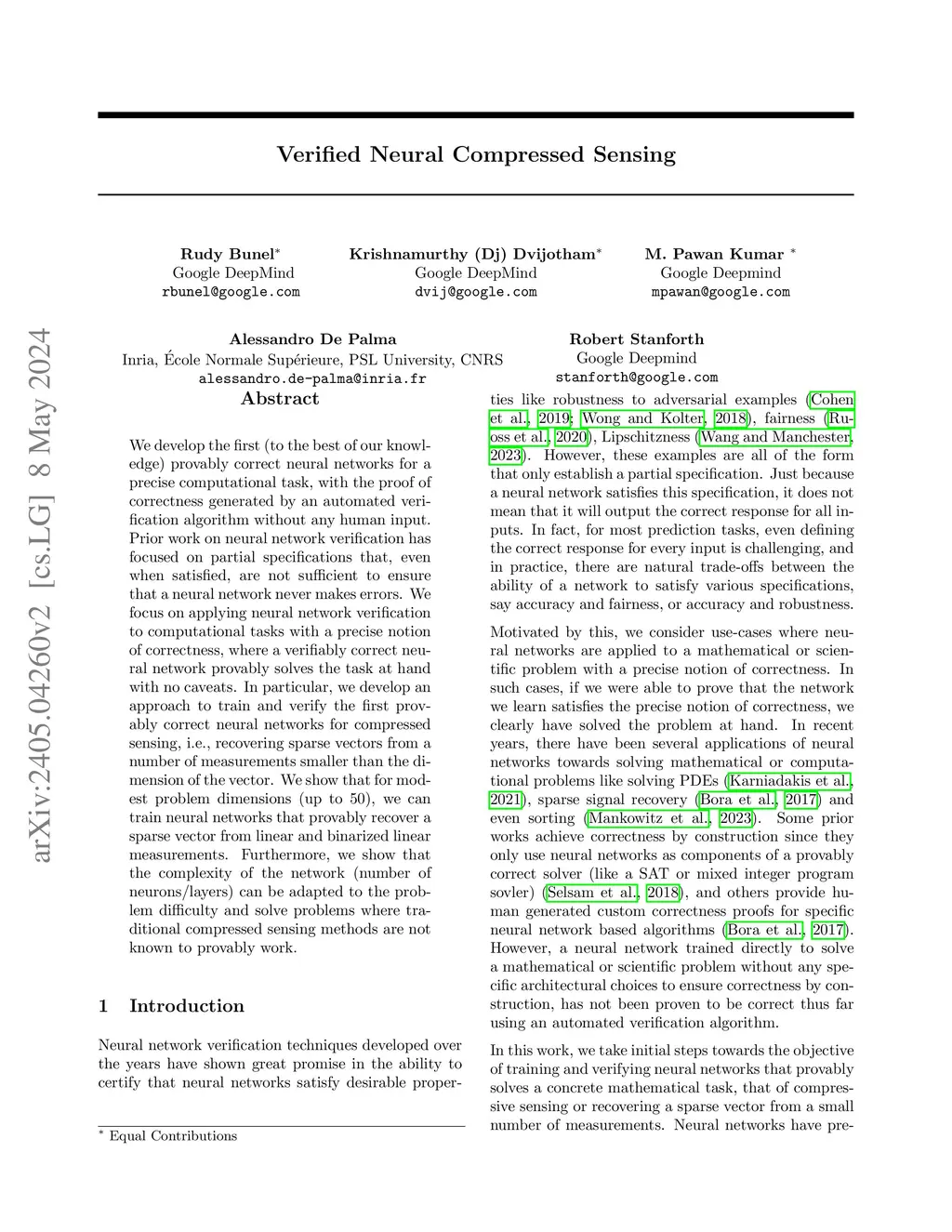 We develop the first (to the best of our knowledge) provably correct neural networks for a precise computational task, with the proof of correctness generated by an automated verification algorithm without any human input. Prior work on neural network verification has focused on partial specifications that, even when satisfied, are not sufficient to ensure that a neural network never makes errors. We focus on applying neural network verification to computational tasks with a precise notion of correctness, where a verifiably correct neural network provably solves the task at hand with no caveats. In particular, we develop an approach to train and verify the first provably correct neural networks for compressed sensing, i.e., recovering sparse vectors from a number of measurements smaller than the dimension of the vector. We show that for modest problem dimensions (up to 50), we can train neural networks that provably recover a sparse vector from linear and binarized linear measurements. Furthermore, we show that the complexity of the network (number of neurons/layers) can be adapted to the problem difficulty and solve problems where traditional compressed sensing methods are not known to provably work.