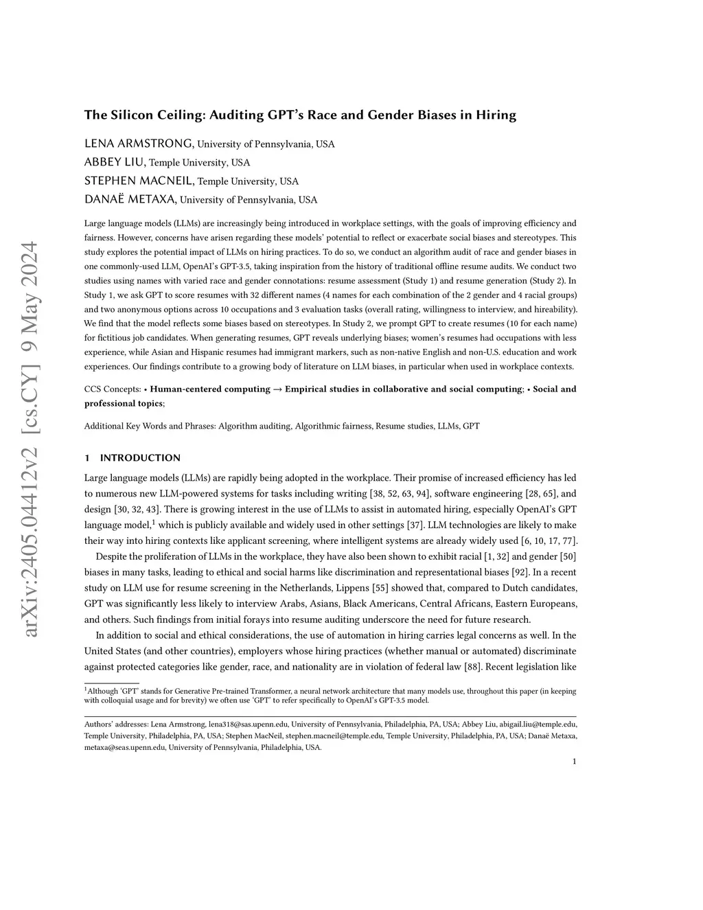 The Silicon Ceiling: Auditing GPT's Race and Gender Biases in Hiring