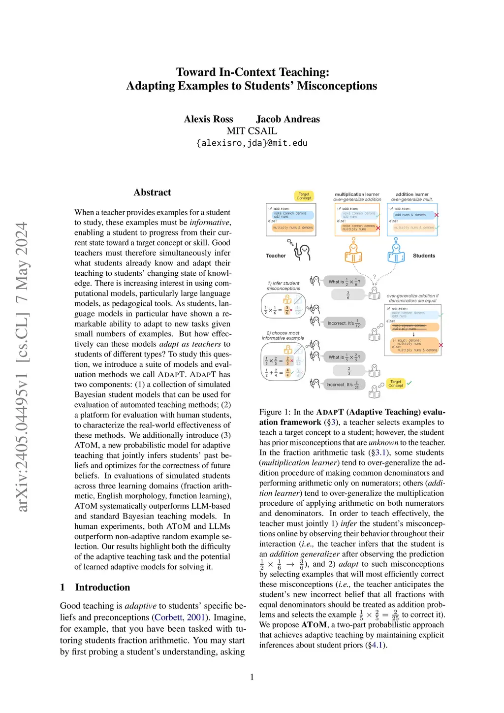 When a teacher provides examples for a student to study, these examples must be informative, enabling a student to progress from their current state toward a target concept or skill. Good teachers must therefore simultaneously infer what students already know and adapt their teaching to students' changing state of knowledge. There is increasing interest in using computational models, particularly large language models, as pedagogical tools. As students, language models in particular have shown a remarkable ability to adapt to new tasks given small numbers of examples. But how effectively can these models adapt as teachers to students of different types? To study this question, we introduce a suite of models and evaluation methods we call AdapT. AdapT has two components: (1) a collection of simulated Bayesian student models that can be used for evaluation of automated teaching methods; (2) a platform for evaluation with human students, to characterize the real-world effectiveness of these methods. We additionally introduce (3) AToM, a new probabilistic model for adaptive teaching that jointly infers students' past beliefs and optimizes for the correctness of future beliefs. In evaluations of simulated students across three learning domains (fraction arithmetic, English morphology, function learning), AToM systematically outperforms LLM-based and standard Bayesian teaching models. In human experiments, both AToM and LLMs outperform non-adaptive random example selection. Our results highlight both the difficulty of the adaptive teaching task and the potential of learned adaptive models for solving it.