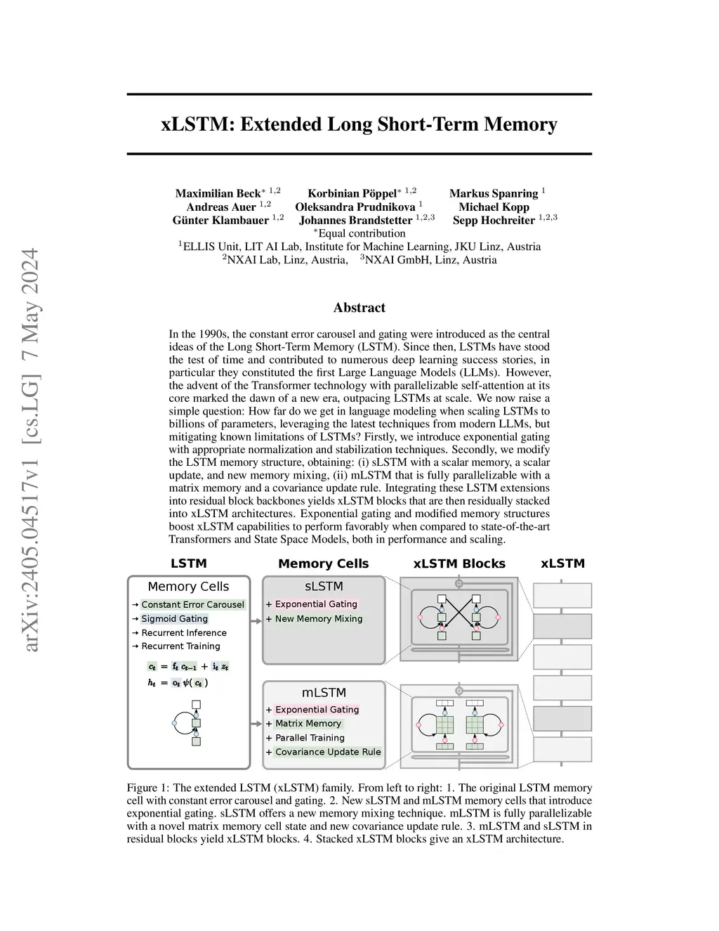 In the 1990s, the constant error carousel and gating were introduced as the central ideas of the Long Short-Term Memory (LSTM). Since then, LSTMs have stood the test of time and contributed to numerous deep learning success stories, in particular they constituted the first Large Language Models (LLMs). However, the advent of the Transformer technology with parallelizable self-attention at its core marked the dawn of a new era, outpacing LSTMs at scale. We now raise a simple question: How far do we get in language modeling when scaling LSTMs to billions of parameters, leveraging the latest techniques from modern LLMs, but mitigating known limitations of LSTMs? Firstly, we introduce exponential gating with appropriate normalization and stabilization techniques. Secondly, we modify the LSTM memory structure, obtaining: (i) sLSTM with a scalar memory, a scalar update, and new memory mixing, (ii) mLSTM that is fully parallelizable with a matrix memory and a covariance update rule. Integrating these LSTM extensions into residual block backbones yields xLSTM blocks that are then residually stacked into xLSTM architectures. Exponential gating and modified memory structures boost xLSTM capabilities to perform favorably when compared to state-of-the-art Transformers and State Space Models, both in performance and scaling.