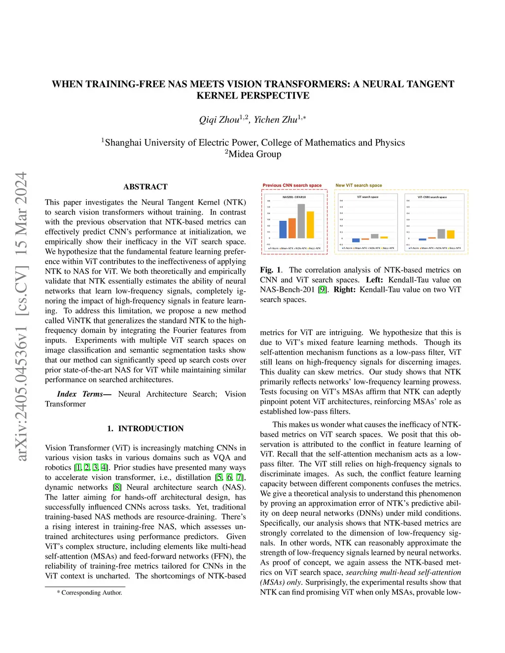 This paper investigates the Neural Tangent Kernel (NTK) to search vision transformers without training. In contrast with the previous observation that NTK-based metrics can effectively predict CNNs performance at initialization, we empirically show their inefficacy in the ViT search space. We hypothesize that the fundamental feature learning preference within ViT contributes to the ineffectiveness of applying NTK to NAS for ViT. We both theoretically and empirically validate that NTK essentially estimates the ability of neural networks that learn low-frequency signals, completely ignoring the impact of high-frequency signals in feature learning. To address this limitation, we propose a new method called ViNTK that generalizes the standard NTK to the high-frequency domain by integrating the Fourier features from inputs. Experiments with multiple ViT search spaces on image classification and semantic segmentation tasks show that our method can significantly speed up search costs over prior state-of-the-art NAS for ViT while maintaining similar performance on searched architectures.