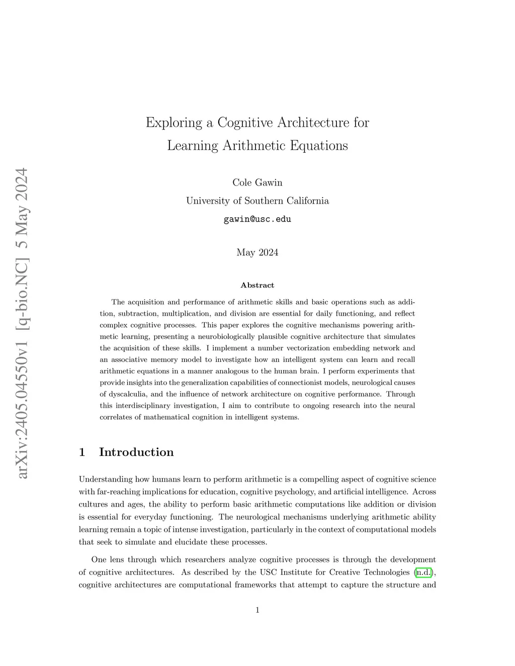 The acquisition and performance of arithmetic skills and basic operations such as addition, subtraction, multiplication, and division are essential for daily functioning, and reflect complex cognitive processes. This paper explores the cognitive mechanisms powering arithmetic learning, presenting a neurobiologically plausible cognitive architecture that simulates the acquisition of these skills. I implement a number vectorization embedding network and an associative memory model to investigate how an intelligent system can learn and recall arithmetic equations in a manner analogous to the human brain. I perform experiments that provide insights into the generalization capabilities of connectionist models, neurological causes of dyscalculia, and the influence of network architecture on cognitive performance. Through this interdisciplinary investigation, I aim to contribute to ongoing research into the neural correlates of mathematical cognition in intelligent systems.