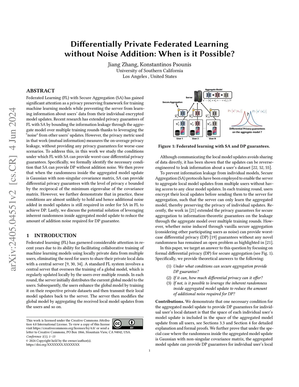 Federated Learning (FL) with Secure Aggregation (SA) has gained significant attention as a privacy preserving framework for training machine learning models while preventing the server from learning information about users' data from their individual encrypted model updates. Recent research has extended privacy guarantees of FL with SA by bounding the information leakage through the aggregate model over multiple training rounds thanks to leveraging the "noise" from other users' updates. However, the privacy metric used in that work (mutual information) measures the on-average privacy leakage, without providing any privacy guarantees for worse-case scenarios. To address this, in this work we study the conditions under which FL with SA can provide worst-case differential privacy guarantees. Specifically, we formally identify the necessary condition that SA can provide DP without addition noise. We then prove that when the randomness inside the aggregated model update is Gaussian with non-singular covariance matrix, SA can provide differential privacy guarantees with the level of privacy bounded by the reciprocal of the minimum eigenvalue of the covariance matrix. However, we further demonstrate that in practice, these conditions are almost unlikely to hold and hence additional noise added in model updates is still required in order for SA in FL to achieve DP. Lastly, we discuss the potential solution of leveraging inherent randomness inside aggregated model update to reduce the amount of addition noise required for DP guarantee.