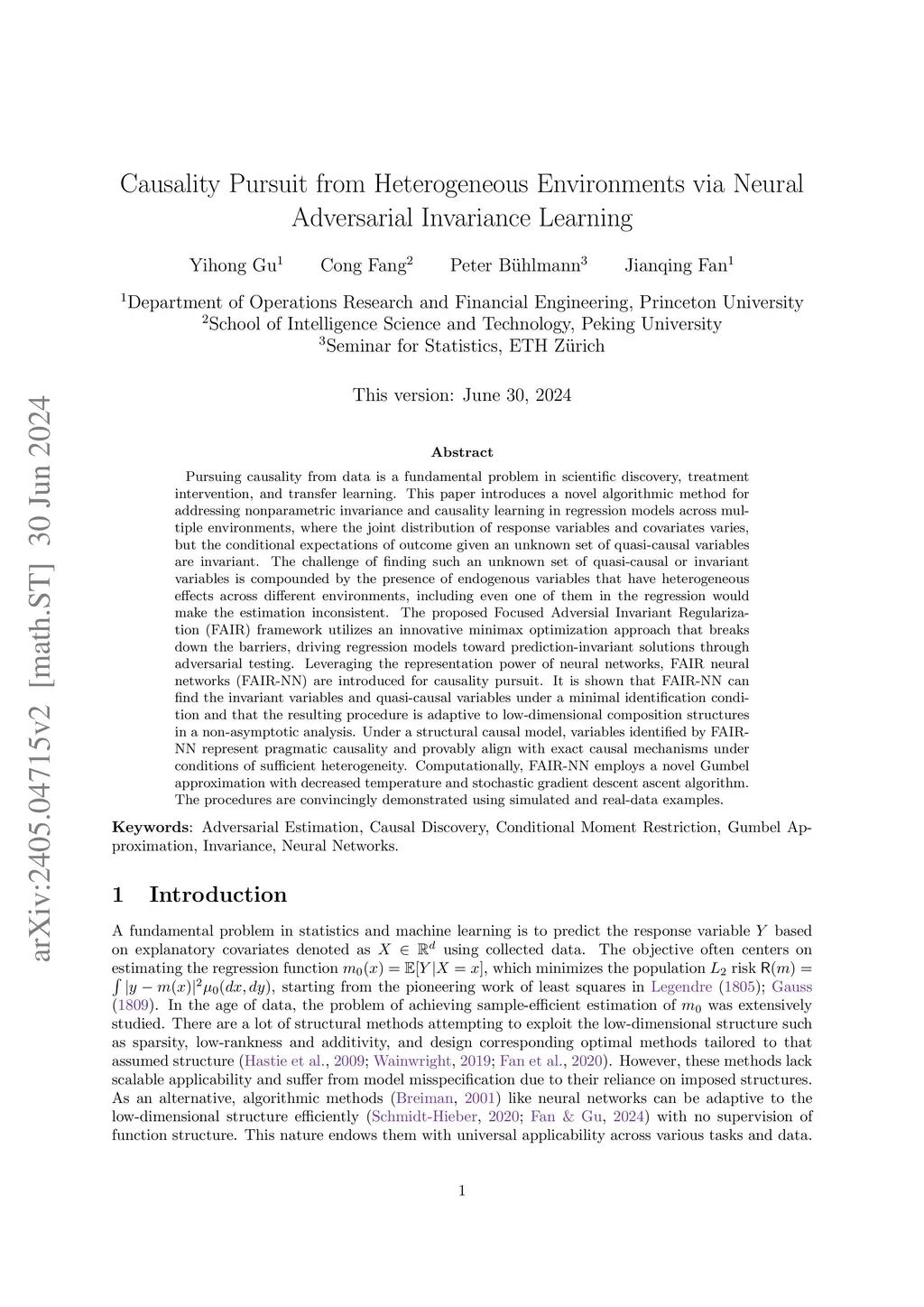 Pursuing causality from data is a fundamental problem in scientific discovery, treatment intervention, and transfer learning. This paper introduces a novel algorithmic method for addressing nonparametric invariance and causality learning in regression models across multiple environments, where the joint distribution of response variables and covariates varies, but the conditional expectations of outcome given an unknown set of quasi-causal variables are invariant. The challenge of finding such an unknown set of quasi-causal or invariant variables is compounded by the presence of endogenous variables that have heterogeneous effects across different environments. The proposed Focused Adversarial Invariant Regularization (FAIR) framework utilizes an innovative minimax optimization approach that drives regression models toward prediction-invariant solutions through adversarial testing. Leveraging the representation power of neural networks, FAIR neural networks (FAIR-NN) are introduced for causality pursuit. It is shown that FAIR-NN can find the invariant variables and quasi-causal variables under a minimal identification condition and that the resulting procedure is adaptive to low-dimensional composition structures in a non-asymptotic analysis. Under a structural causal model, variables identified by FAIR-NN represent pragmatic causality and provably align with exact causal mechanisms under conditions of sufficient heterogeneity. Computationally, FAIR-NN employs a novel Gumbel approximation with decreased temperature and a stochastic gradient descent ascent algorithm. The procedures are demonstrated using simulated and real-data examples.
