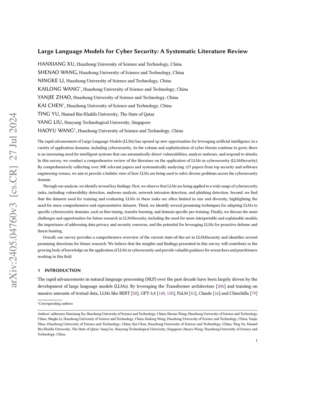 Large Language Models for Cyber Security: A Systematic Literature Review